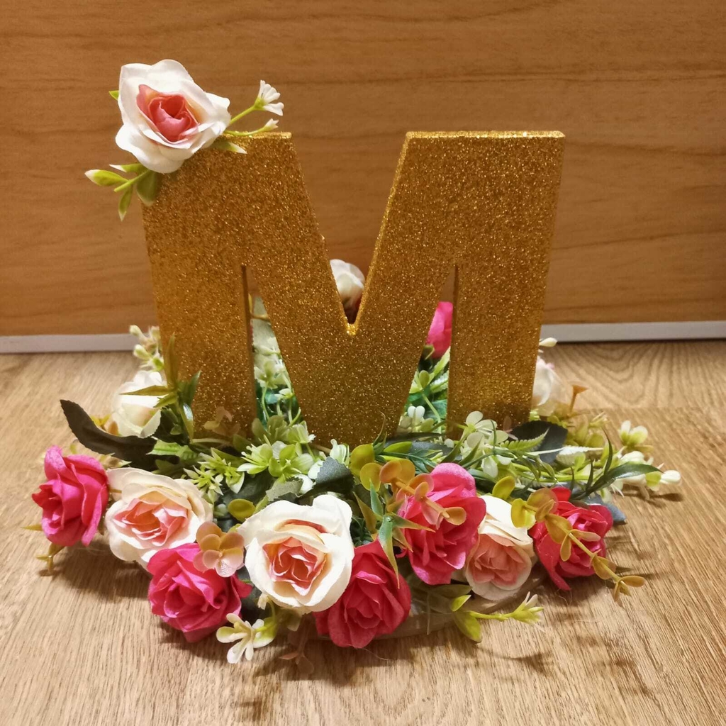 centro de mesa inicial o numero de mesapuede ser dorado o plateadoel color de las flores es a eleccionmedida: 20 cm de diametro x 16 cm de alto aprox