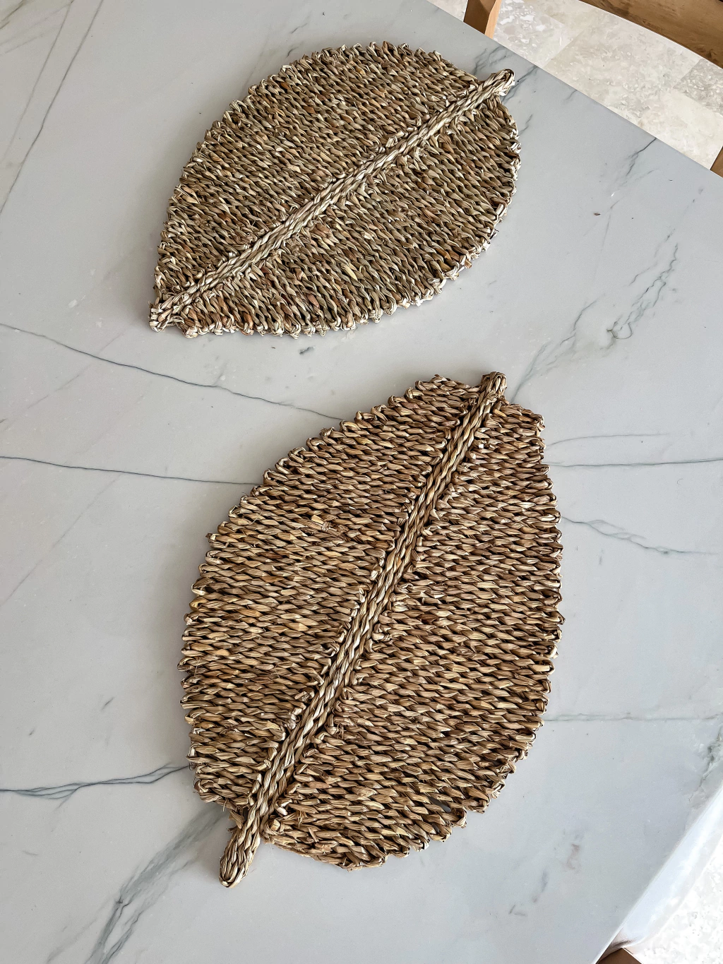 Individual de Seagrass color natural, con forma de hoja.Medidas: 48cm x 35cm.