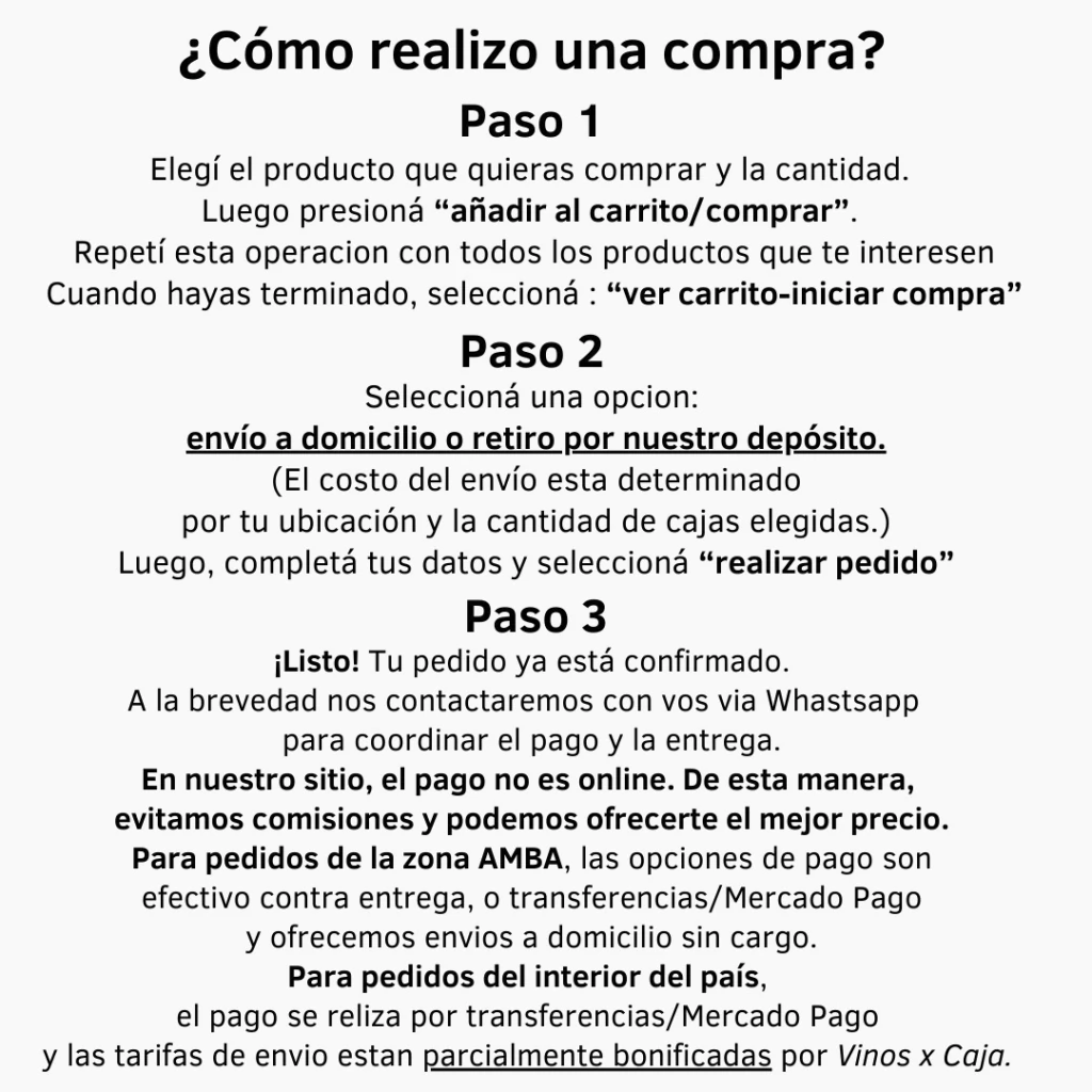 ¿Qué formas de pago puedo aprovechar para abonar mi compra?Efectivo. (Pagas tu pedido cuando te lo entregamos) (Solo disponible en AMBA)Transferencias bancarias o a traves de Mercado Pago. (Pago anticipado)Tarjetas de debito a través de Mercado Pago. (Pago anticipado)Tarjetas de crédito: 10% de recargo sobre los precios publicados. (Pago anticipado)¿Puedo pagar con tarjeta de crédito? ¿Hay cuotas?Si, podes pagar con crédito. Esta opción tiene un 10% de recargo sobre los precios de lista. Consultá por cuotas sin interés.¿Puedo abonar mi pedido cuando lo recibo?Si, podes abonar tu pedido cuando lo recibis. En ese caso, el pago deberá ser en efectivo. (Solo disponible para clientes de AMBA)Clientes del interior del país, deberan abonar su pedidopor transferencia de forma anticipada.¿Realizan Factura "A"?Si, podes solicitarla al momento de realizar tu pedido, completando tu CUIT y aclarando que necesitas factura A. También podrás solicitarla por Whatsapp.¿Cuál es el costo de envío?En AMBA, elenvío es gratuitopidiendo 2 o 3 cajas, según tu ubicación. Para pedidos de solo 1 caja, ofrecemos tarifas de envio low cost.Para pedidos que van alinterior del paísofrecemostarifas bonificadas, para que el costo del envío tenga baja incidencia en el precio de tus vinos.¿Cómo se realizan los envíos? ¿Cuánto demoran?En AMBA, los envios los realiza una empresa de logistica urbana.Demoran entre 24 y 48hs hábiles.Para pedidos que van al interior del país, enviamos por Andreani/Correo Argentino/Via Cargo o expresos elegidos por el cliente y demoran entre 48 y 72hs hábiles.Cada operación se coordina particularmente.¿Dónde puedo recibir mi pedido?Realizamos envíos atodo el país. Para clientes del interior del país, existe la posibilidad de entregar los pedidos en sucursales del correo o puntos de retiro (en caso de existir dichos punos en tu ciudad). Ésta suele ser la opción mas economica.¿Dónde estan ubicados? ¿Puedo retirar personalmente?Nuestro depósito esta ubicadoen Banfield, a pocas cuadras de la cancha del Club Atlético Banfield.Si queres retirar tu pedido, coordinaremos un dia y horario y te compartiremos la ubicacion exacta.¿Venden al por mayor?Si, para pedidos mayoristas tenemos otra lista y otras condiciones. Podes solicitar el catálogo y despejar tus dudas por Whatsapp.¿Puedo combinar etiquetas?Si, en nuestra web verás publicadas cajas surtidas pre-armadas con los productos que mas nos piden.También podes armar tu propia caja de vinos surtidos con hasta 3 etiquetas diferentes. Para hacerlo, tendrás que realizar tu pedido via Whatsapp.