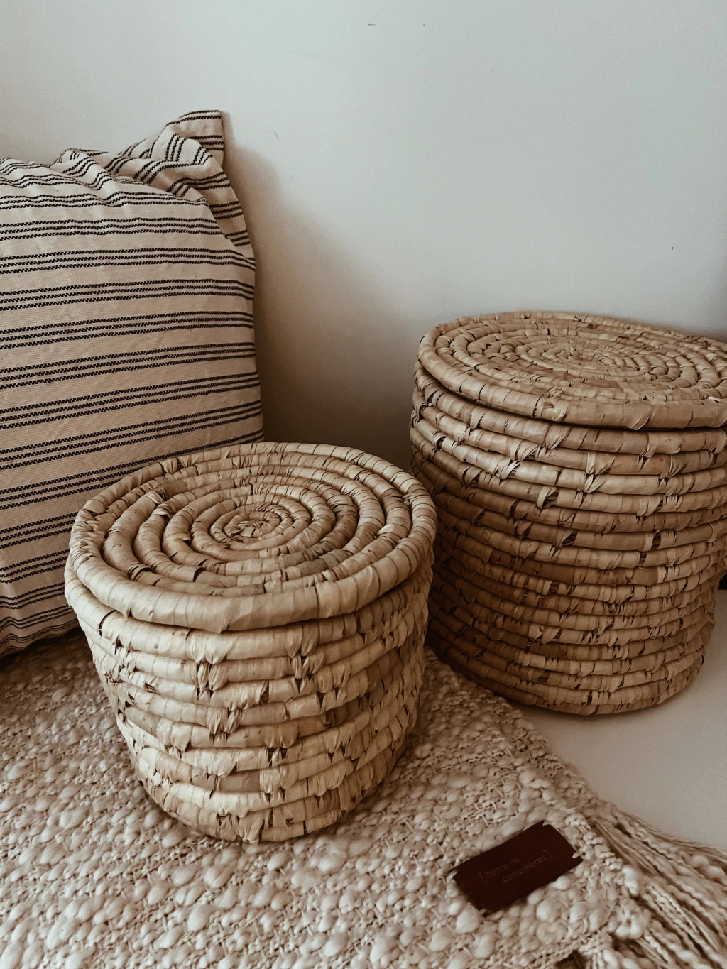 Cesto de Jacinto con tapaMedidas:chico: 21 cm de diam x 18 cm de altoMediano: 25 cm de diam. x 24 cm de altoGrande: 27 cm de diam. x 25 cm de alto