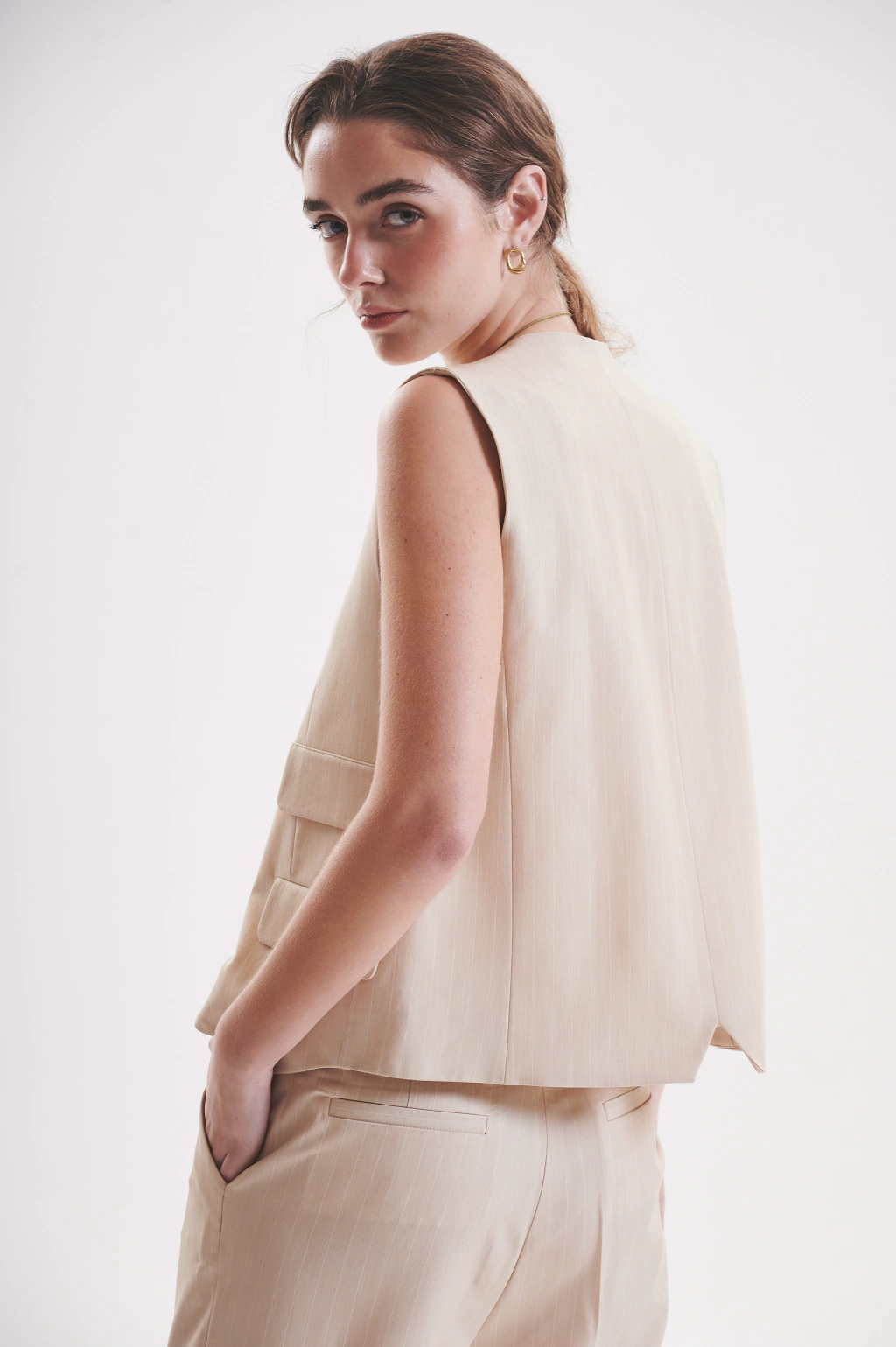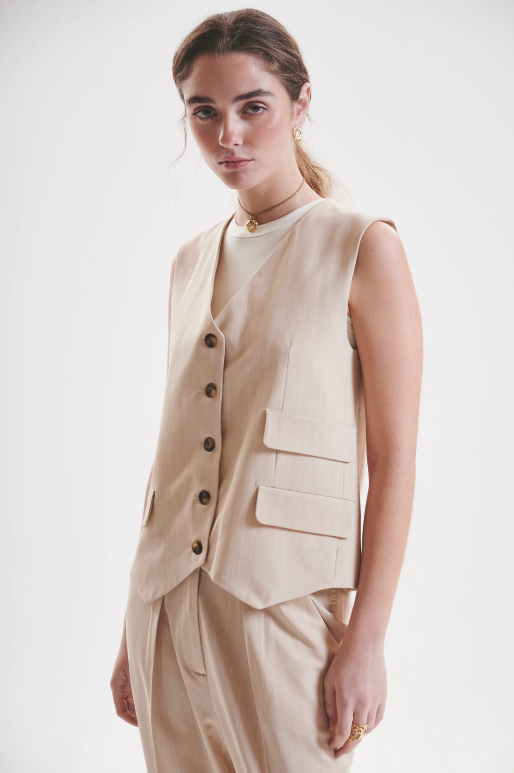 Chaleco confeccionado en tela sastrera, de calce holgado,el frente tiene terminación en picos, lleva cinco botones en el frente y tres bolsillos con solapa.Entretelado y forrado con tafeta jacquard en su interior.Los chalecos están confeccionados por nuestros sastres profesionales, sus terminaciones son a mano, de forma artesanal.Encontralo también en color negro y rayado gris.En conjunto con pantalón pedra.Composición:96% poliester 4% spandex.Agus en las imágenes usa Talle S y sus medidas sonAltura 1,72 cmBusto 82 cmCintura 59 cmCadera 88 cmTalle SAncho de hombros 35 cmContorno busto 94 cmContorno cintura 96 cmLargo total 58 cmTalle MAncho de hombros 39 cmContorno busto 98 cmContorno cintura 100 cmLargo total 62 cmTalle LAncho de hombros 43 cmContorno busto 102 cmContorno cintura 104cmLargo total 66 cmCuidados:Limpieza profesional en seco.*Hecho en Argentina.