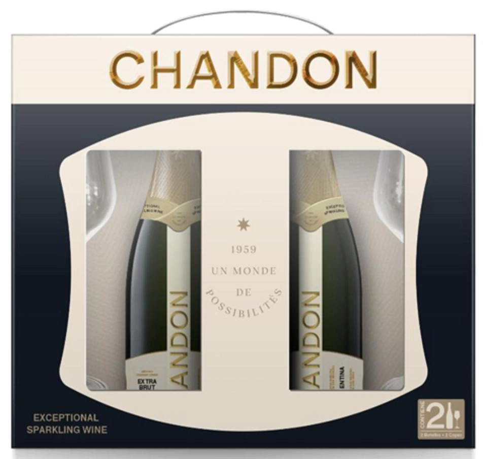 Estuche de cartón con:2 Chandon Extra Brut 75cl2 Copas- Todos nuestros productos son finamente envueltos,listos para regalar-