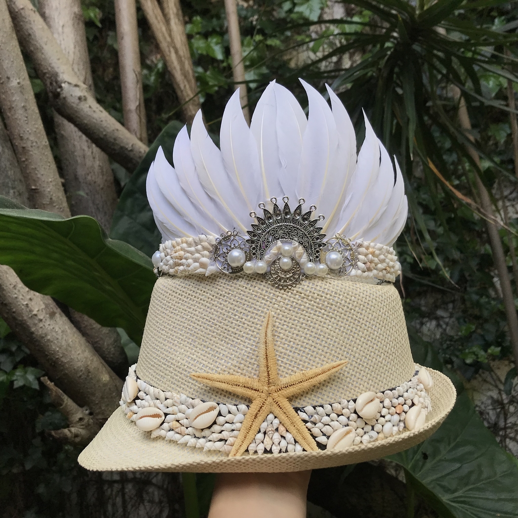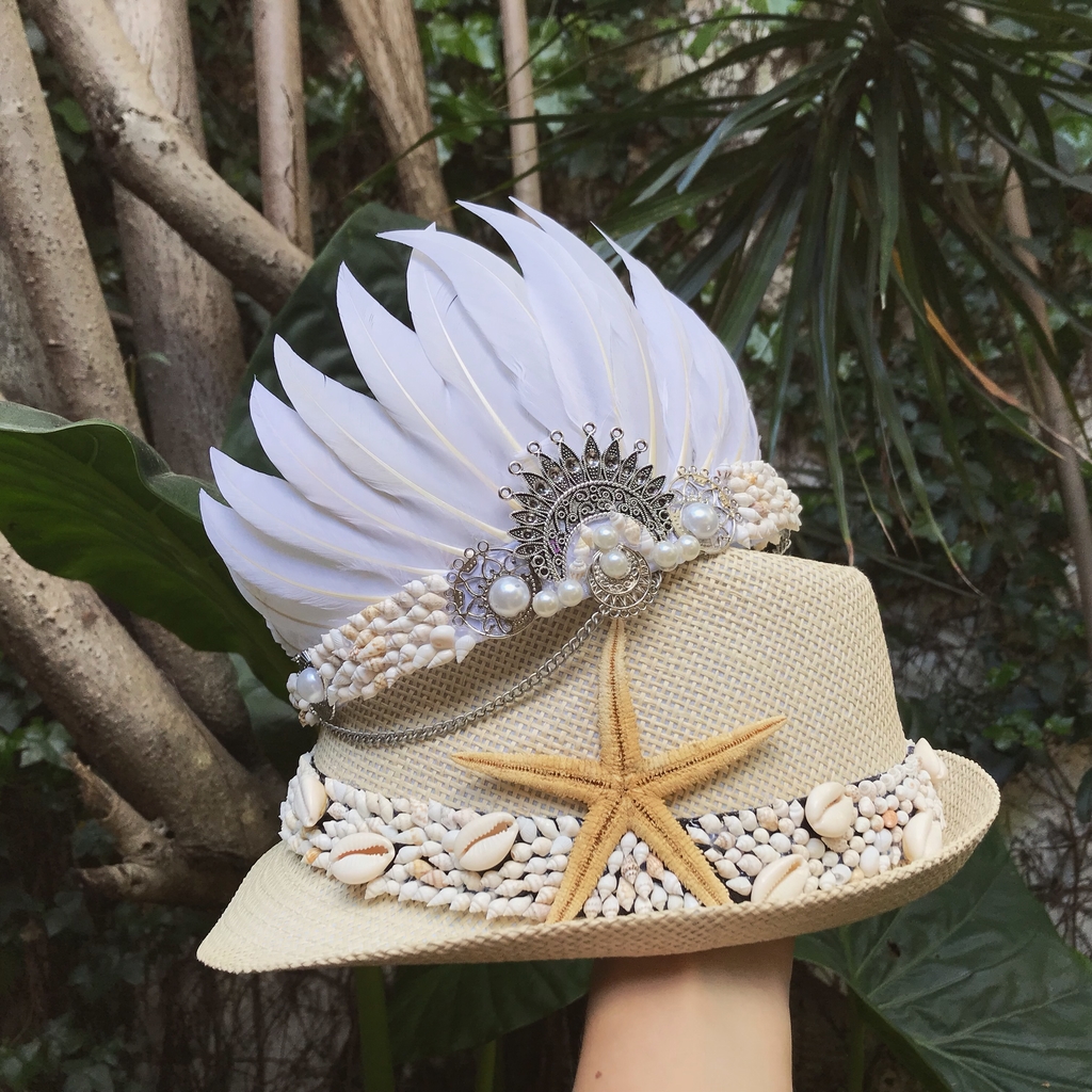 Este combo de corona de caracoles y sombrero panameño haciendo juego combina a la perfección con esa pareja fanática de vivir en patas con los pies en la arena y el pelo salado.