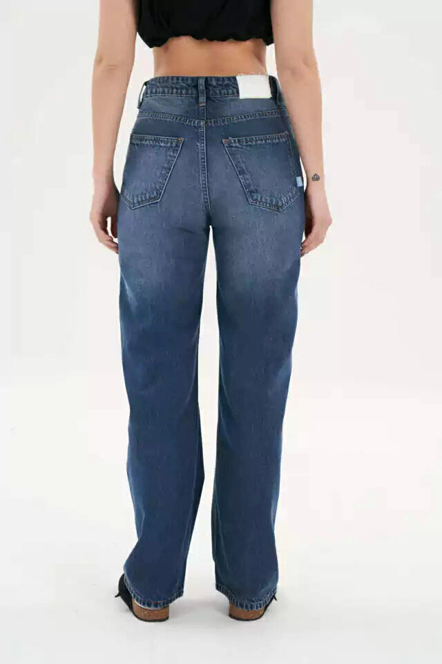 Jean recto tiro alto confeccionado en denim 100% algodón de aspecto rígido. Calce cinco bolsillos con amplitud sutil en botamangas.