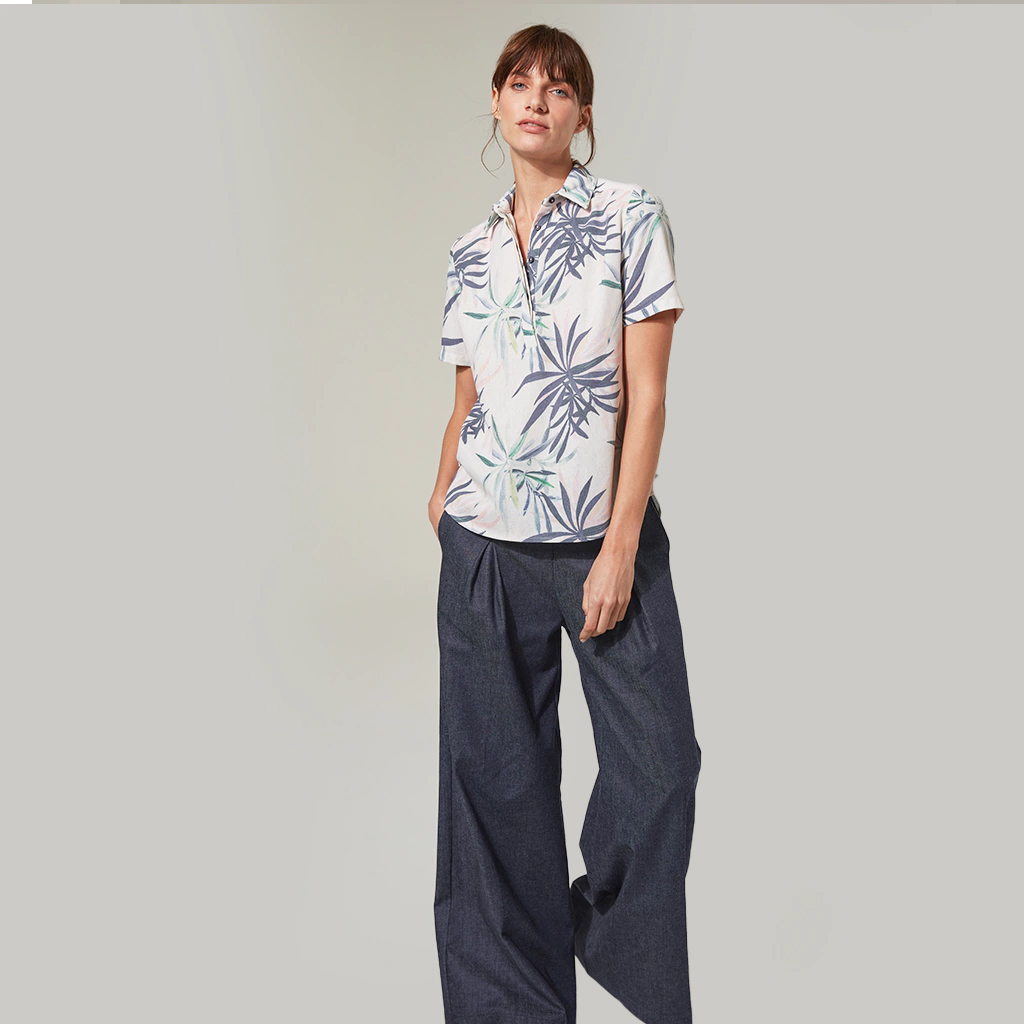BLUSA TIPO CHOMBA, MANGA CORTA, CON VISTA DE BOTONES OCULTATELA: LINO RAYON ESTAMPADO A FLORES AZULES, VIOLETAS Y ROSASLARGO: 65 CM DELANTERO - TRASERO 70 CM