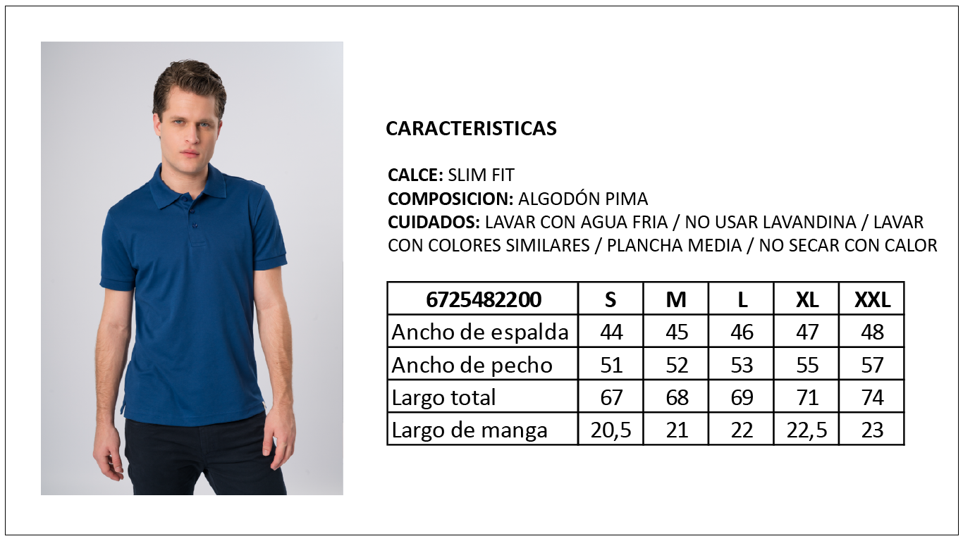 Chomba en pique micropima, con cuello y puños tejidos. La tela es algodon pima/poliester, cuyas caracteristicas son las siguientes: