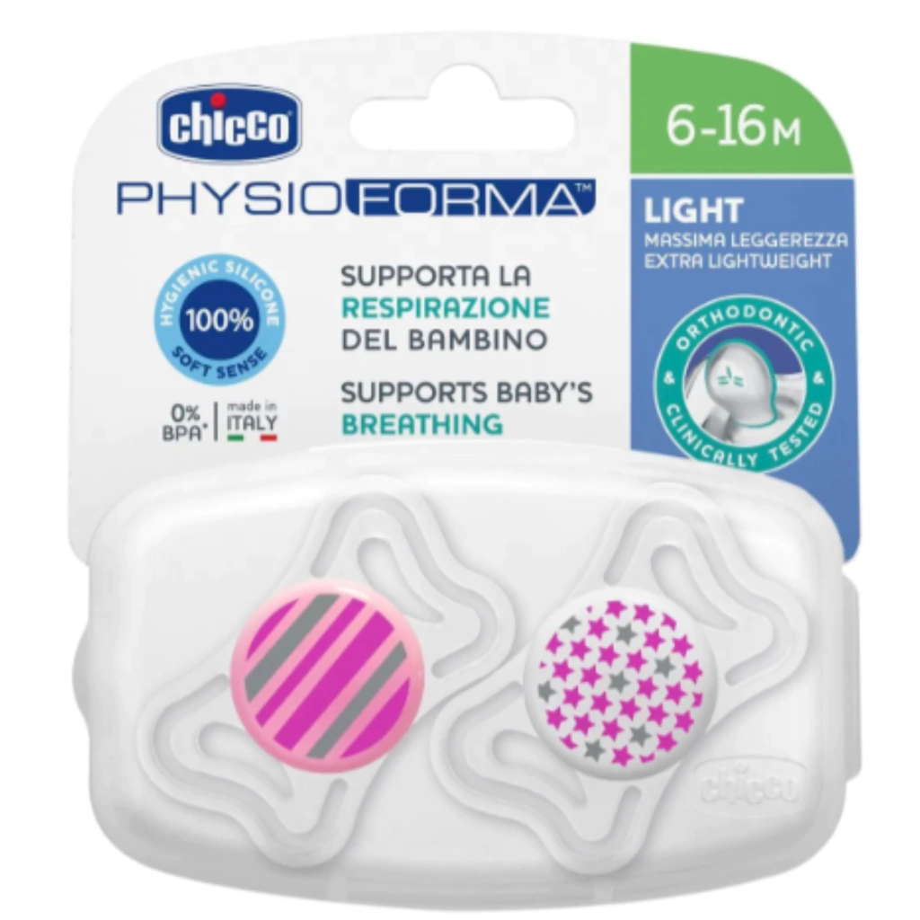 Descripción:Chupete extra ligero y con orificios de gran aireación para que la carita del bebé no sufra y se irrite con el contacto del chupete.Con tetina de silicona higiénica que no se deforma, y su exclusivo acabado extra suave resulta muy agradable y sedoso.Todos los chupetes CHICCO son PhysioForma, la exclusiva forma ayuda a colocar la lengua hacia adelante y favorecer así la respiración fisiológica del bebé.Contiene un estuche con dos unidades.Edadrecomendada de6-16 meses.