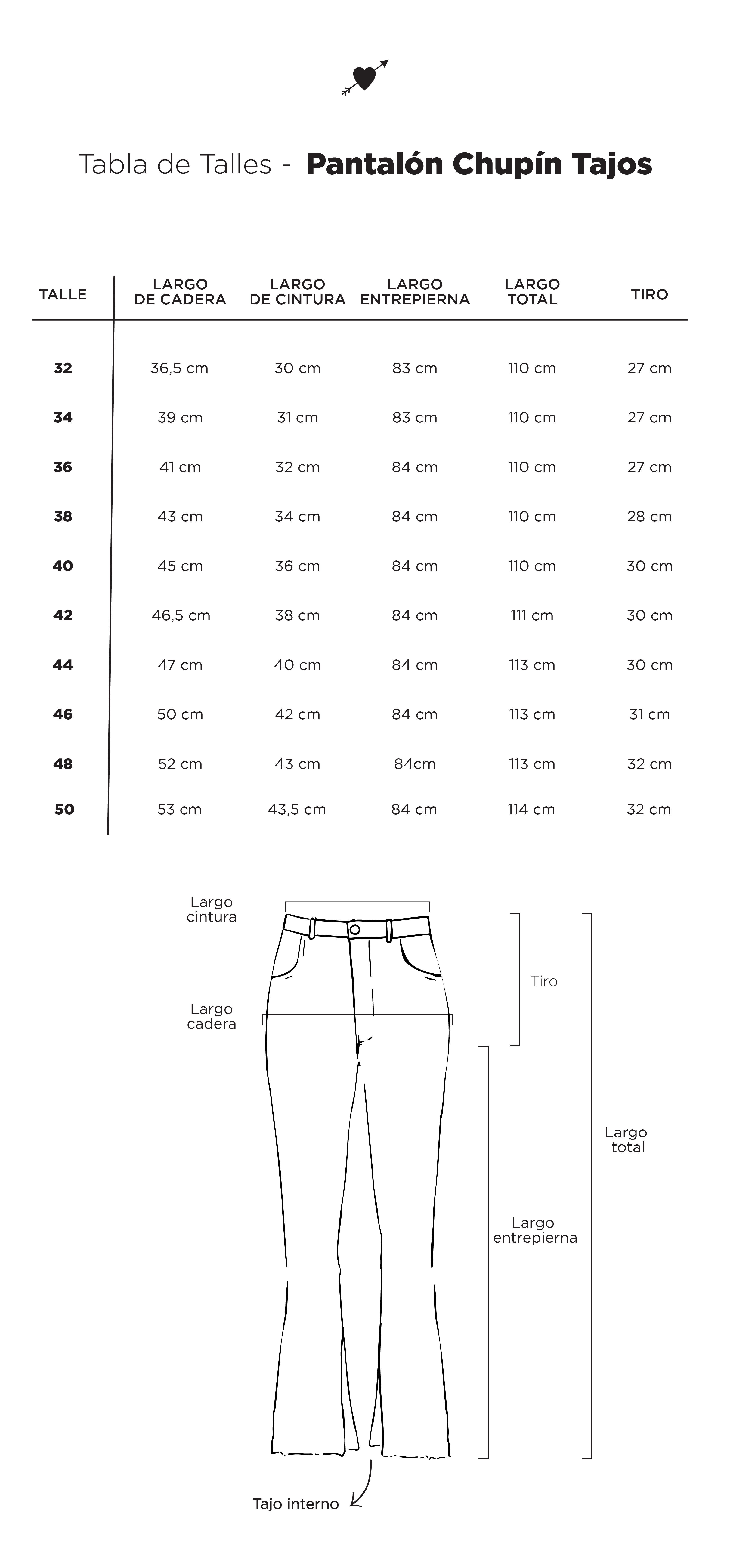 - Guía de talles: 32/XXS - 34/XS - 36/S - 38/M - 40/L - 42/XL - 44/XXL - 46/XXXL - 48/XXXXL - 50/XXXXXL