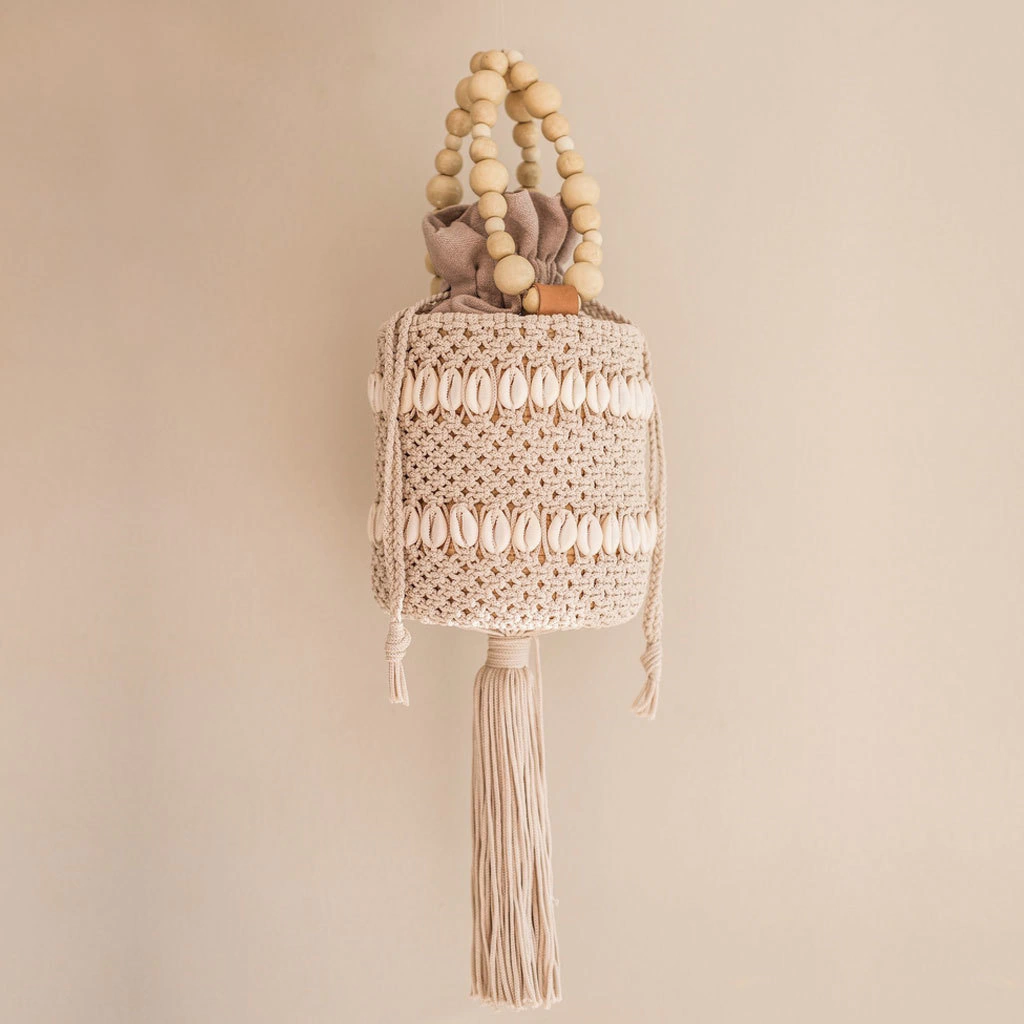 Bolso totalmente realizado en fibras naturales (carandillo), con adornos en macrame de algodon y caracoles.