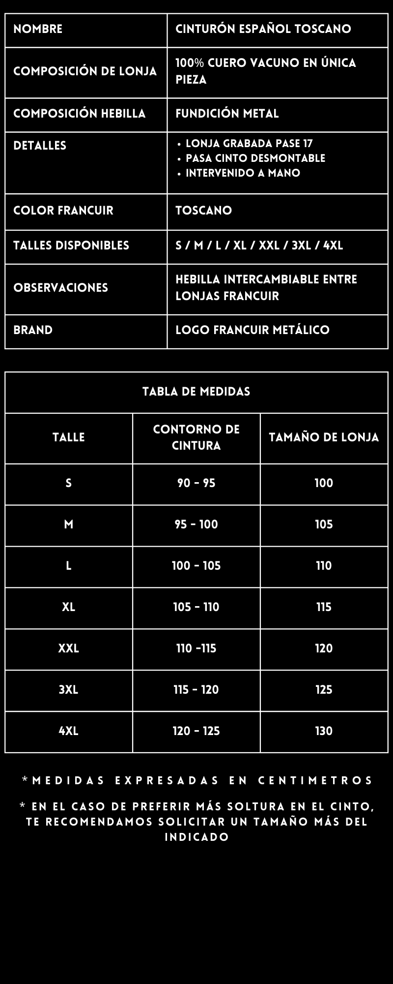Características: Correa 100% cuero vacuno grabada e intervenida a mano (38mm de ancho) - Hebilla 100% metálica de diseño robusto, estilo español. - Pasacinto de cuero con logo FRANCUIR metálico a tono con hebilla y broches