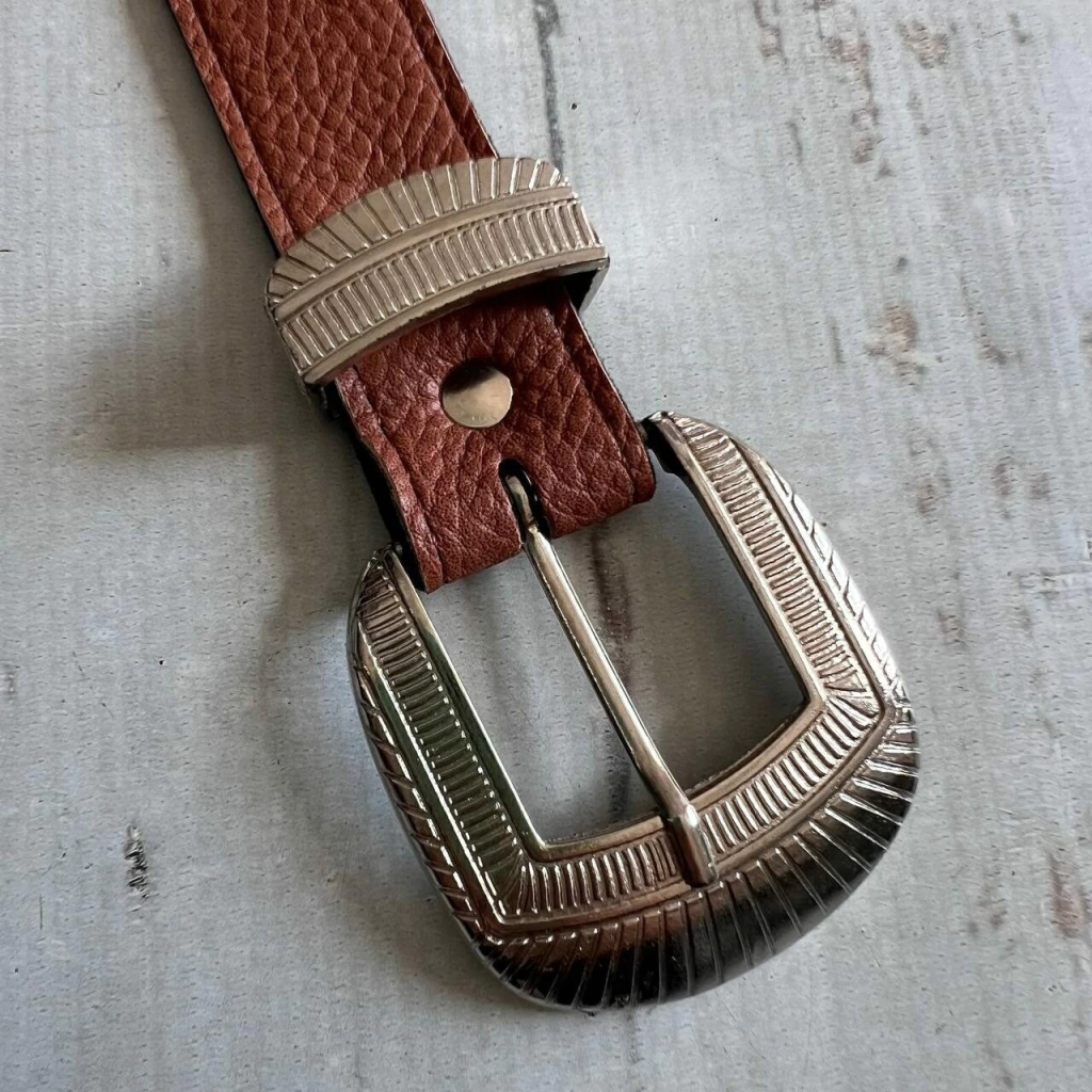 Cinto de ecocuero marrón con hebilla labrada, franjas.