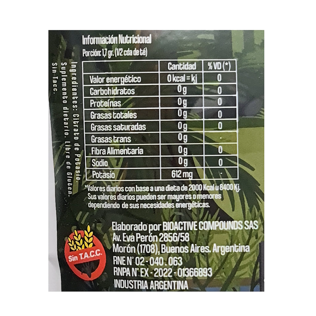 Citrato de Potasio en Polvo blanco granular x 300gr (sin TACC)Beneficios de su consumo y uso:- Controla la acidez (PH) del cuerpo- Ayuda al funcionamiento del sistema nerviosos central y la musculatura- Correlacionada con la salud ósea y cerebrovascular- Alivia calambres- Ayuda a regular la presión arterialLa suplementación de Citrato de Potasio debe ser supervisada por un profesional de la saludConsultar por ventas mayoristas a Empresas y DistribuidoresFraccionado para: Bad MonkeyCertificación sin TACCRNE: 02-040.063RNPA: EX-2022-01366893