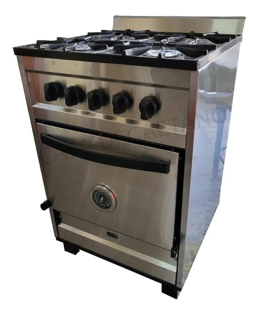 CARACTERISTICAS- Multi-gas: robinetes adaptables a distintos tipos de gas.- Parte superior: Mesada en acero inoxidable, reforzada en hierro angulo en los bordes.- Rejillas: fundicion de hierro.- Hornallas: aluminio.- Bandeja superiores: anti-derrame de líquidos acero, desmontables.- Perillas: de plastico reforzado de alta resistencia, embutidas para una mayor proteccion.- Reloj de temperatura en puerta.- Exterior: Construida totalmente en Acero Inoxidable- Aislacion termica de lana de vidrio.- Interior del horno zingado.- Piso de ladrillo refractario de alta retención calórica.- Horno con valvula de seguridad- MEDIDAS:Alto: 855mmAncho: 580mmProfundidad: 625mm