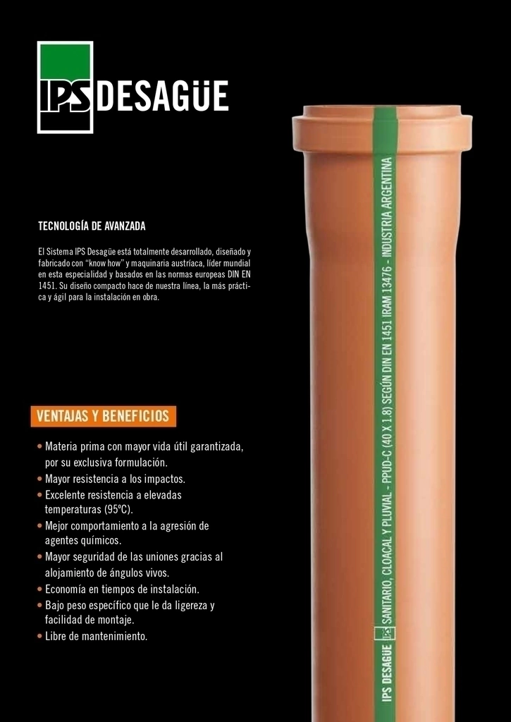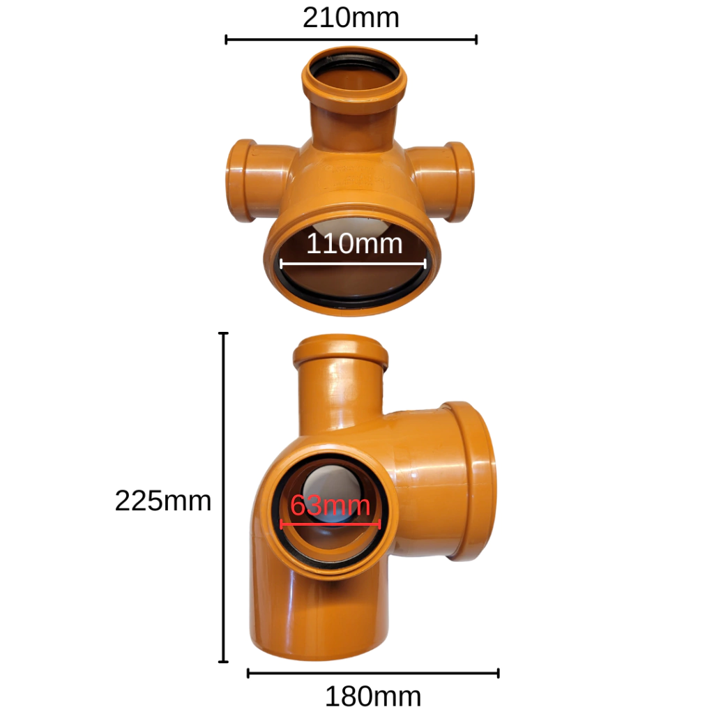 Características- Marca: IPS.- Línea: Desagüe con Oring.- Diámetro: 110mm.- Articulo: Codo de 110 M-H a 90° con triple acometida.- Un extremo hembra de 110, un extremo macho de 110.- Tres acometidas Abiertas Hembra de 63.- Unión Deslizante, Hermeticidad en todo el sistema.- Oring de Doble Labio.- Excepcionales ventajas en la instalación.- No precisa pegar, ni adhesivo.- Se conecta solo con solución Deslizante.- Todos los extremos hembra llevan oring.- Compatible con cualquier Desague con Oring.- Puede conectarse a PVC Blanco.- Utilización para Cloacas o Pluviales.- Mayor resistencia a los impactos.- Excelente resistencia a alta presión y temperaturas (95°).- Ligereza y facilidad de montaje.- Garantía escrita por 50 Años.