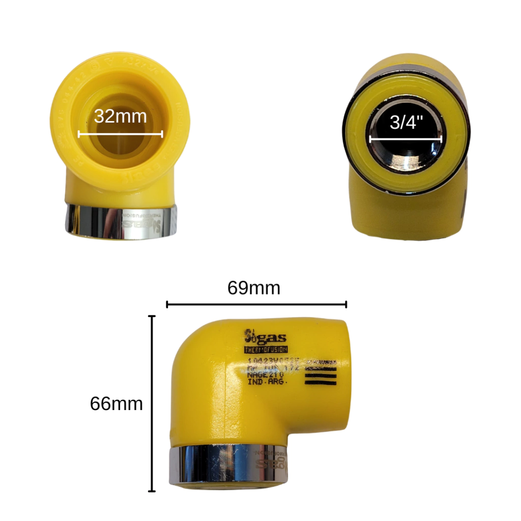 Características- Marca: DEMA.- Linea: SIGAS.- Diametro: 32mm - 3/4".- Articulo: Codo a 90° Fusion Reduccion Rosca Hembra.- Un extremo Fusion 32 mm, Un extremo Rosca Metalica H 3/4".- Termofusion Amarilla para GAS.- Fusion Primera Marca Aprobada por Bureau Veritas.- Especificacion Tecnica NAG E210, res. 3251/2005 ENARGAS.- Solo Compatible con Fusion Sigas.- No permite Aprobacion mezcla de marcas.- En caso de Aprobacion solo se aprueba embutido en pared.- Tuberias Expuestas a Intemperie deben recubrirse con Cinta de Aluminio.- Sigas ofrece Cinta de Aluminio Aprobada.- Evita el repintado y mantenimiento del revestimiento epoxi- Excepcionales ventajas en la instalación.- Tubos y Conexiones con estructura interna de Acero, maxima seguridad.- Tubos y Conexiones con protección Anticorrosiva del Polietileno.- La seguridad de la unión por Thermofusion.- Facilita las modificaciones y reparaciones.- Evita el repintado y mantenimiento del revestimiento epoxi.- Garantía escrita por 50 Años.