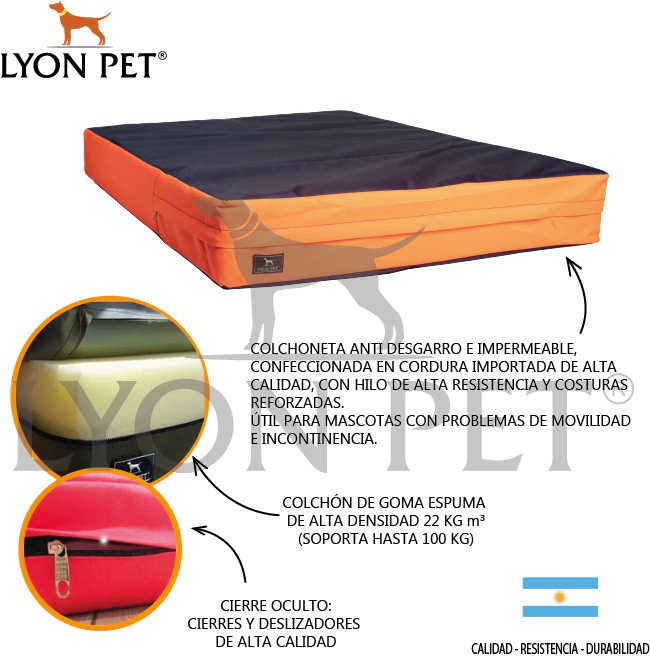 Colchon Antidesgarro Impermeable con Funda- COLCHONETA ANTIDESGARRO EIMPERMEABLE.- AMBOS LADOS DE LA FUNDACONFECCIONADOS CON LA MISMA TELA.- HILOS FUERTES Y COSTURA REFORZADA.- PLACA DE GOMA ESPUMA DEPOLIURETANO DE ALTADENSIDAD 22KG (M3).- CIERRE Y DESLIZADORES DE ALTA CALIDAD.- TELA CORDURA IMPORTADA.- - FÁCIL LAVADO. LAVADO A MANO O LAVARROPA PROGRAMA LENTO -SUAVE. NO CENTRIFUGAR.- ORTOPEDICO.MEDIDA:70 cm X 50 cm X 10 cmEl colchón LYONPET ofrece a tu perro un descanso óptimo y de calidad en su día a día.Es una cama que puedes usar tanto dentro como fuera de casa gracias a tu tejido impermeable de gran resistencia que se limpia con gran facilidad.Este colchón tiene una placa de goma espuma de alta densidad que a tu perro le encantará dormir en él.Además, es especialmente útil para mascotas con pocamovilidad o con problemas de articulaciones y columna.Tiene forma rectangular y permite que tumascota suba o baje de la cama por cualquiera de suslaterales, para que la comodidad de uso sea total.Aunque el tejido impermeable del colchón resiste a lasmanchas y a la suciedad, la tela es desenfundable para poder lavarla fácilmente en lavarropas, así la cama de tu perro lucirá siempre como el primer día. Con este colchón ofreces el máximo confort a tu mascota para que duerma plácidamente y te evitas un extra de trabajo gracias a su fácil limpieza.Como las personas, los animales también sufrenproblemas articulares y de columna, ya sea por malasposturas, descalcificación de los huesos, artrosis...Estas dolencias se acusan aún más después de unas horas sobre la cama, por eso disponer de uncolchón ergonómico y de buenacalidad es fundamental.Si buscas la mayor comodidad para tu mascota,el colchón ortopédico para perrosLYON PET te ofrece resultados y calidad.VENTAJAS DE TENER UNA COLCHONETA LYON PET:- PLACA GOMA ESPUMA DE ALTA DENSIDAD.- TELA DE EXCELENCIA.- IMPERMEABLE.- útil para mascotas con pocamovilidad o con problemas de articulaciones y columna.- FÁCIL DE LIMPIAR.¡Gracias por elegir Lyon Pet!Estamos comprometidos con ofrecer productos de alta calidad para tu mascota. Para mantener tu colchoneta antidesgarro e impermeable en óptimas condiciones, te proporcionamos estas recomendaciones de cuidado:Instrucciones de lavado de la funda:Lavado a mano: Es la opción más segura. Usa agua tibia y un detergente suave. Asegúrate de enjuagar bien y secar al aire libre.Lavado en lavarropas: Si decides lavar la funda en lavarropas, selecciona el ciclo de lavado suave. Evita usar ciclos rápidos y, especialmente, no centrifugues la funda, ya que esto puede dañar la película interna de PVC.No mezclar con otras prendas: Lava la funda por separado para evitar que se dañe al rozar con otros tejidos o accesorios durante el ciclo de lavado.Importante: La garantía de Lyon Pet cubre defectos de fabricación, como costuras mal hechas o defectos de materiales. No cubre daños provocados por un lavado o trato inadecuado de la funda.Seguir estas indicaciones te ayudará a prolongar la vida útil de tu colchoneta, asegurando que tu mascota disfrute de la comodidad y protección que Lyon Pet ofrece.