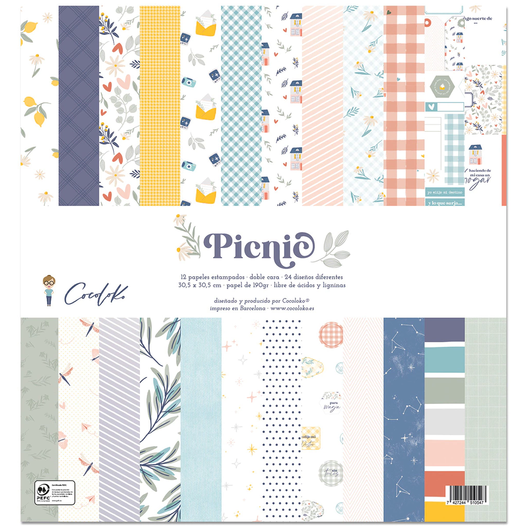 Set con 12 papeles estampados a doble cara. 24 diseños diferentes. Dos de ellos son páginas de tarjetas.Tamaño: 12 x 12“ (30.5 x 30.5 centímetros)Gramaje: 190 grImpresos en offset en papel libre de ácidos y ligninas.