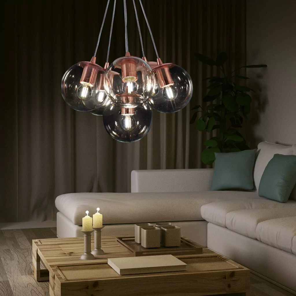 Lámpara con globos de cristal y detalles en cobre o cromo. Posee tensores para regular la altura, es de muy fácil colocación y otorga a tu hogar elegancia y estilo!