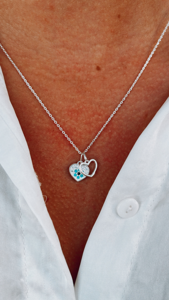 Plata 925 con doble dije : corazon hueco liso y un corazon con cubic celeste y blancos