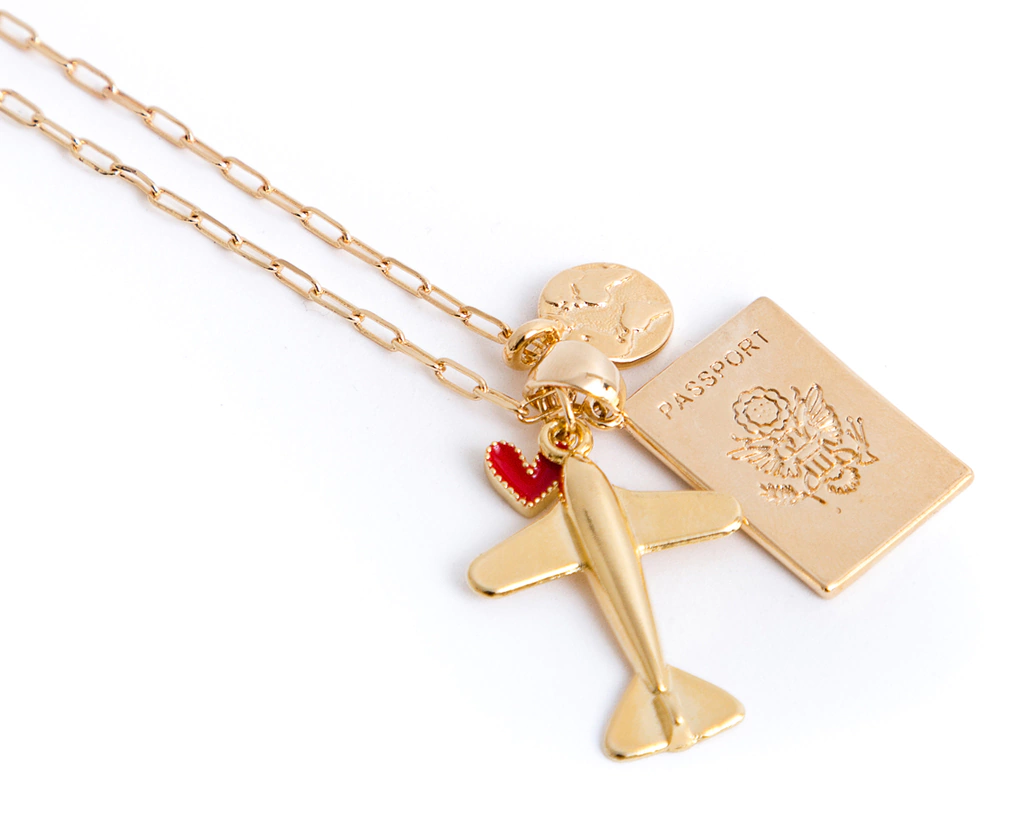 Ideal para los amantes del mundo y los viajes. Collar largo de 60cm, con dije de avion, pasaporte, mundo y corazon esmaltado. Todo bañado en oro 18k
