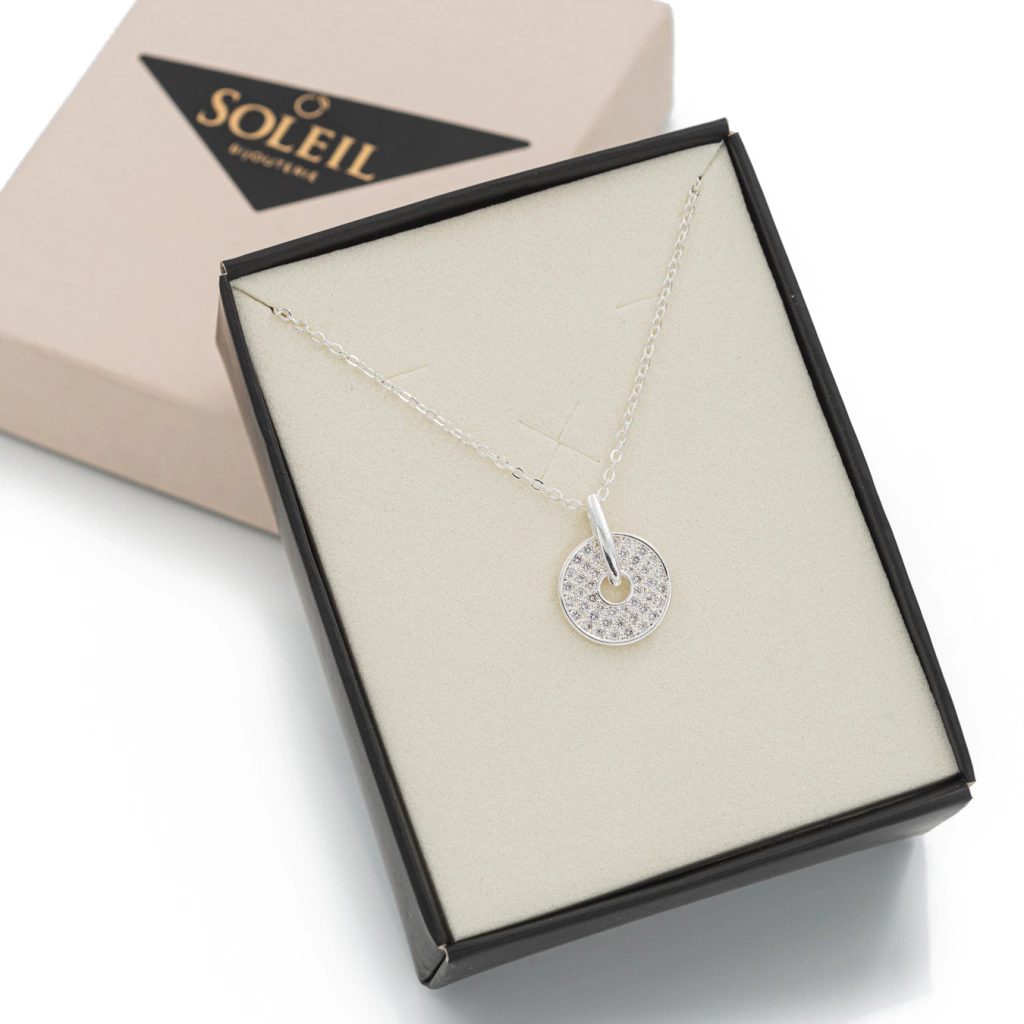 Collar de Acero Quirúrgico Blanco (Acero Quirúrgico con baño de Plata 925), compuesto por: Cadena eslabón Forcet fino de 50cm de largo con cadenita para poder acortar hasta 5cm, con Dije Circular calado con Piedras Micro Pavé (montaje de pequeñas piedras Circón transparente en toda la superficie metálica de una joya), tiene de 1,3cm de ancho; con cierre Gancho Mosquetón.