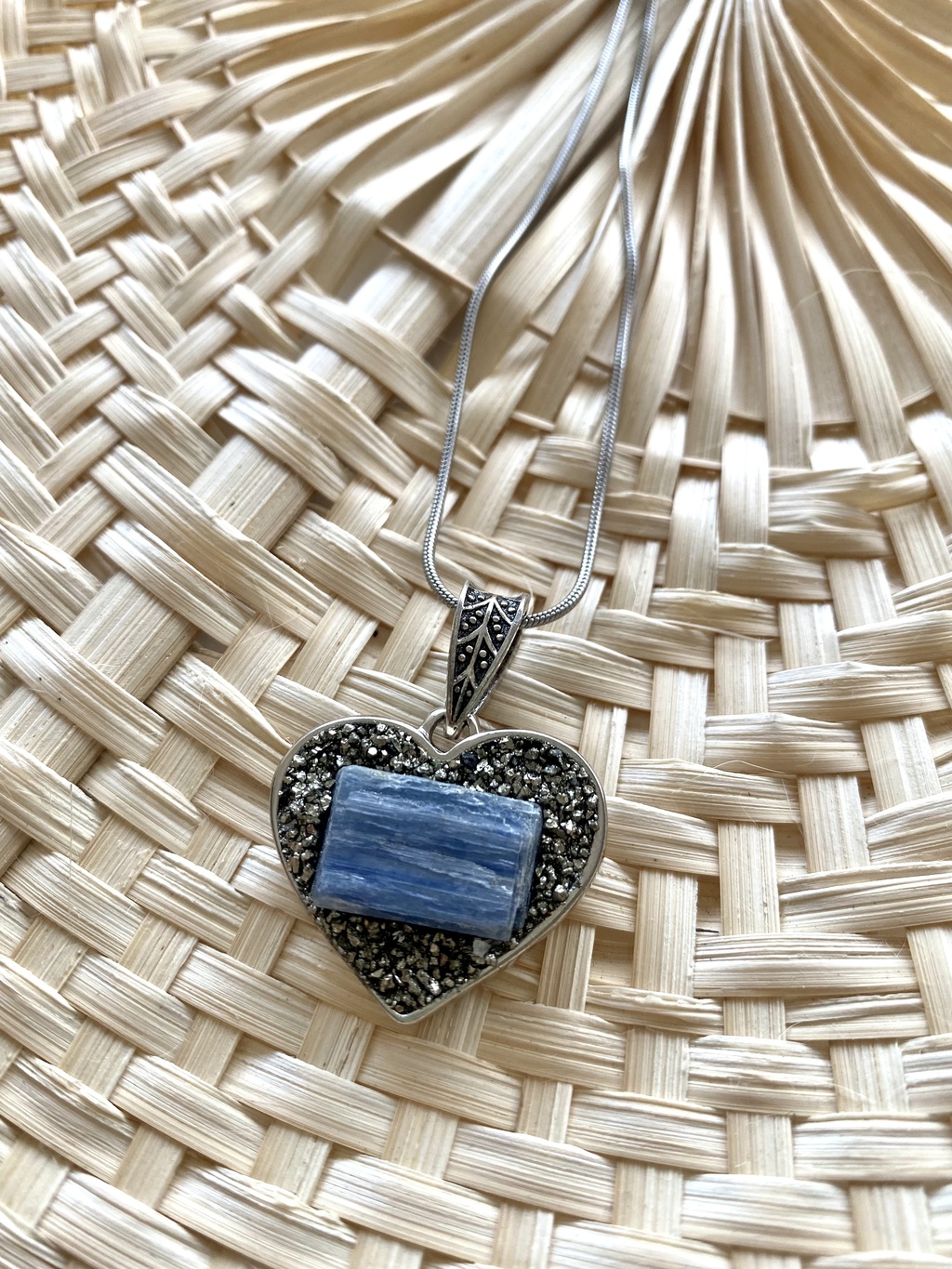 Collar con dije corazón de cainita y piritaEste elegante collar de50 cmestá confeccionado con unacadena de acerode alta calidad, garantizando durabilidad y estilo. Su hermosodije en forma de corazón, elaborado encainitaypirita, no solo es un accesorio atractivo, sino que también posee significados profundos.Lacainitaes conocida por sus propiedades desanaciónytransformación, ayudando en la liberación de emociones negativas y promoviendo el crecimiento personal. Por otro lado, lapirita, a menudo llamada "el oro de los tontos", simboliza laabundanciay laprosperidad, actuando como un poderoso imán para atraer riqueza y éxito.Este collar no solo es un adorno, sino untalismánque te acompañará en tu camino hacia laauto-mejoray laabundancia. Su diseño sofisticado lo hace perfecto para cualquier ocasión, ya sea para un uso diario o un evento especial.¡Llevá contigo el poder transformador de la cainita y la energía positiva de la pirita! Este collar es un recordatorio constante de que la belleza y el bienestar pueden ir de la mano.