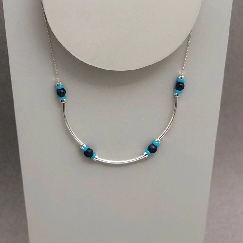 Collar confeccionado con cadena y tubos de plata 925, Lapislázuli, turquesa y Hematite plateado