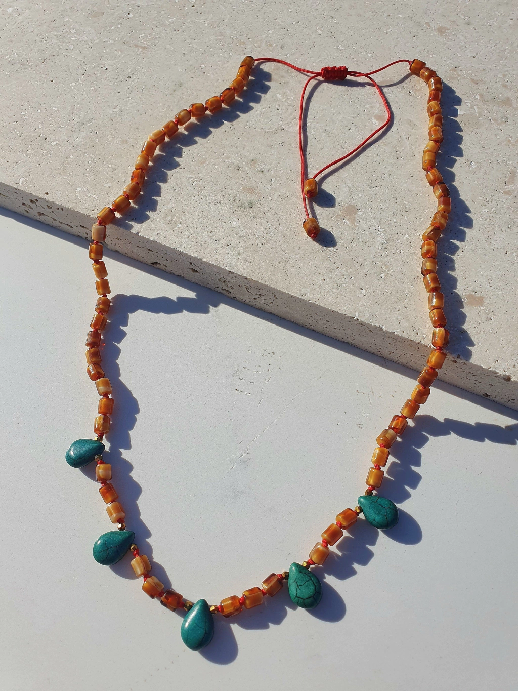 Collar realizado con vidrios hindú separados con nudos de hilo color rojo y detalle de pequeñas gotas de piedra color petróleo