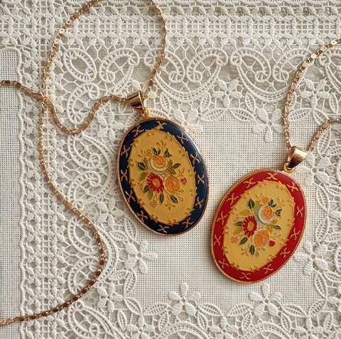 Material cadena: hierro baño doradoLargo cadena: 50 cm.Dije pintado tamaño: 4 cm. de altoAclaración: el dije es una pieza vintage encontrado en alguna de mis recorridas por los mercados de antigüedades que suelo visitar. Si ves alguna marca o detalle en su terminaciones es propio de su origen e historia. Y lo que la hace mucho más especial!