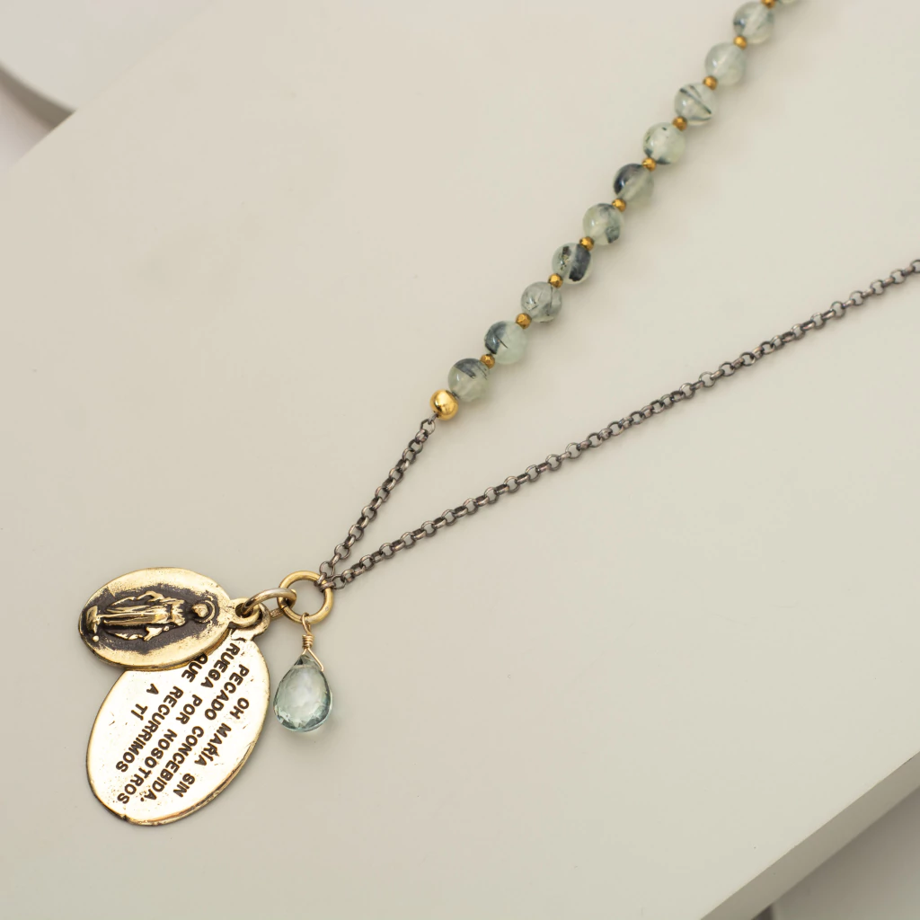 Collar confeccionado con cadena de plata pavonada, doce cuarzos turmalinados que simbolizan los doce apóstoles representados con estrellas en la Medalla Milagrosa, y dos gotas de amatista verde y perlas representando los rayos de gracia. Medallas de bronce pavonado con la imagen de la virgen y su oración.