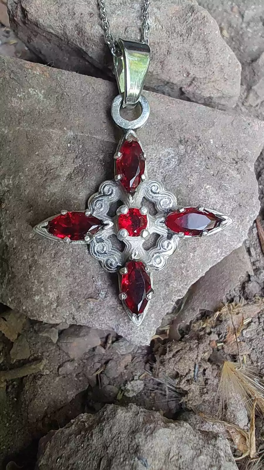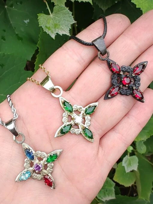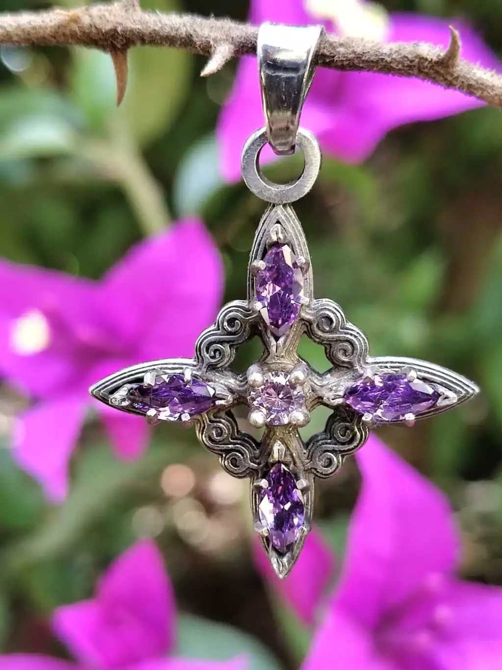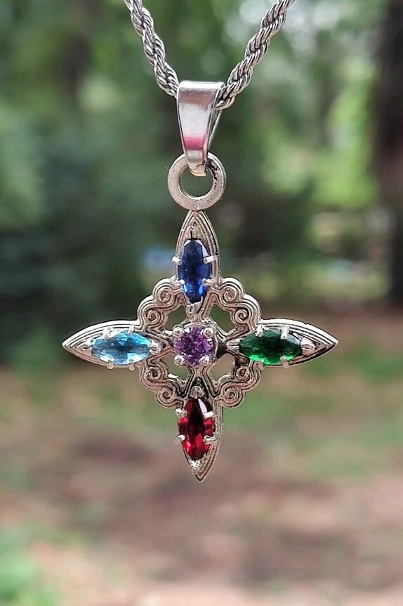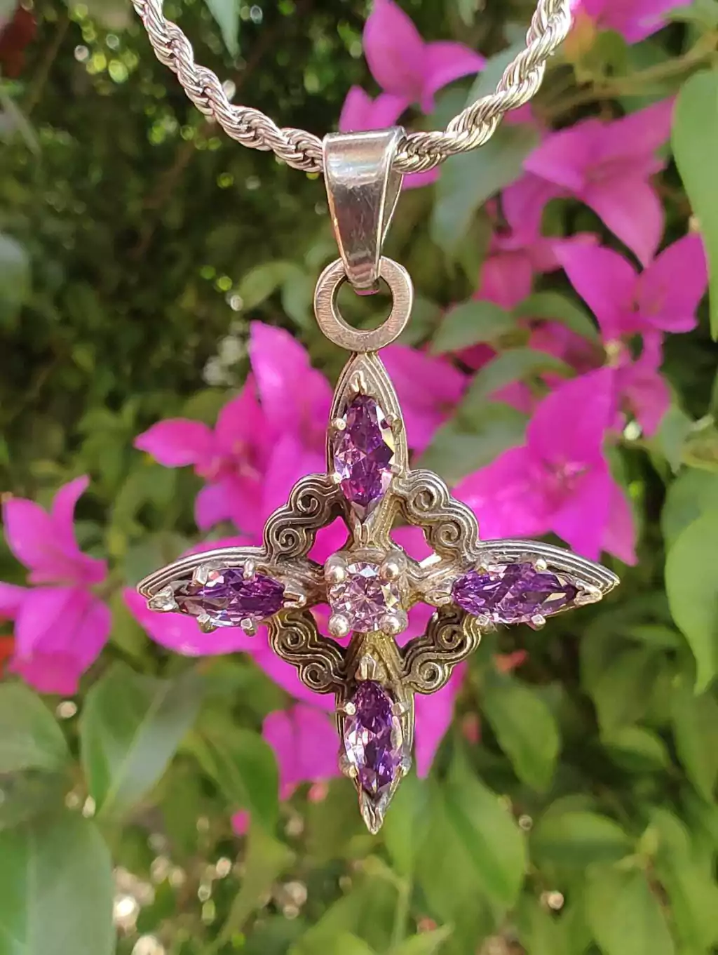 Importante collar Nudo De Brujas con cinco Zirconias Cúbicas, el modelo principal presenta cuatro cristales Navet en color Amatista y un Brillante central Rosa de Francia. Dije elaborado en Plata Alemana / Alpaca o Bronce y también disponible en Plata 925 para su elaboración (otra publicación). Cadena Tourbillon de Acero Quirúrgico. Puede personalizar la pieza en las opciones disponibles de variantes, tanto colores de piedras como material del metal y cadena.Medidas: 4cm + pasa cadena.Cadena Tourbillon de 45cm o 60cm. Especificar al momento de finalizar su compra en el área de "notas".Cadenita rolo oval espejada de 45cm bañada en Oro para las versiones de Bronce (doradas).El nudo de las brujas es un legendario amuleto de protección. Está asociado con la capacidad de proteger o amarrar a tus seres queridos. En la antigüedad este nudo era solo para protección.