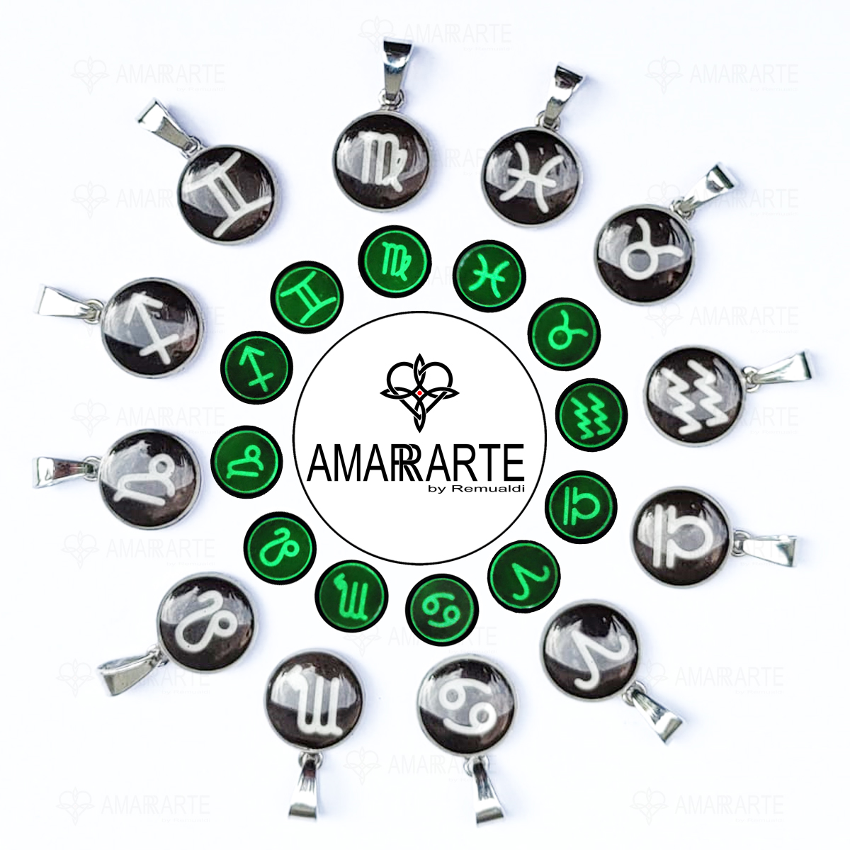 Dijes Signos del Zodiaco que brillan en la oscuridad en tono Verde intenso luego de ser cargados unos instantes en Luz natural o artificial.