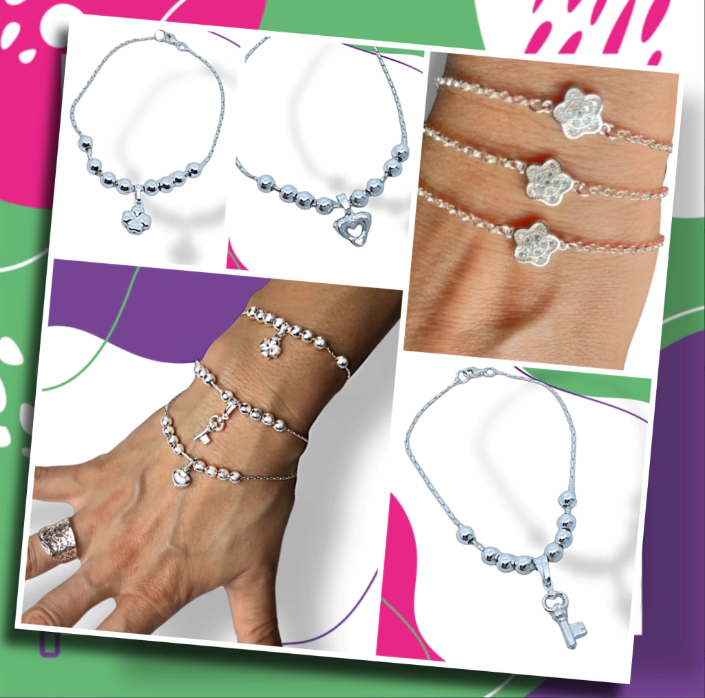 Combo de 4 pulseras con dijes de plata 925 a precio promocional.INCLUYE LAS PULSERASN24 CON DIJE TREBOLN34 CON DIJE DELFINESN36 CON DIJE LLAVEN68 CON DIJE FLOR