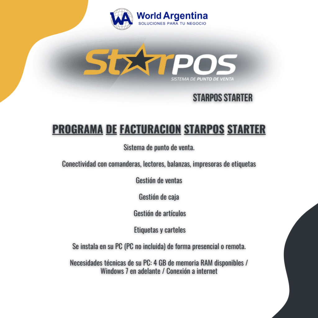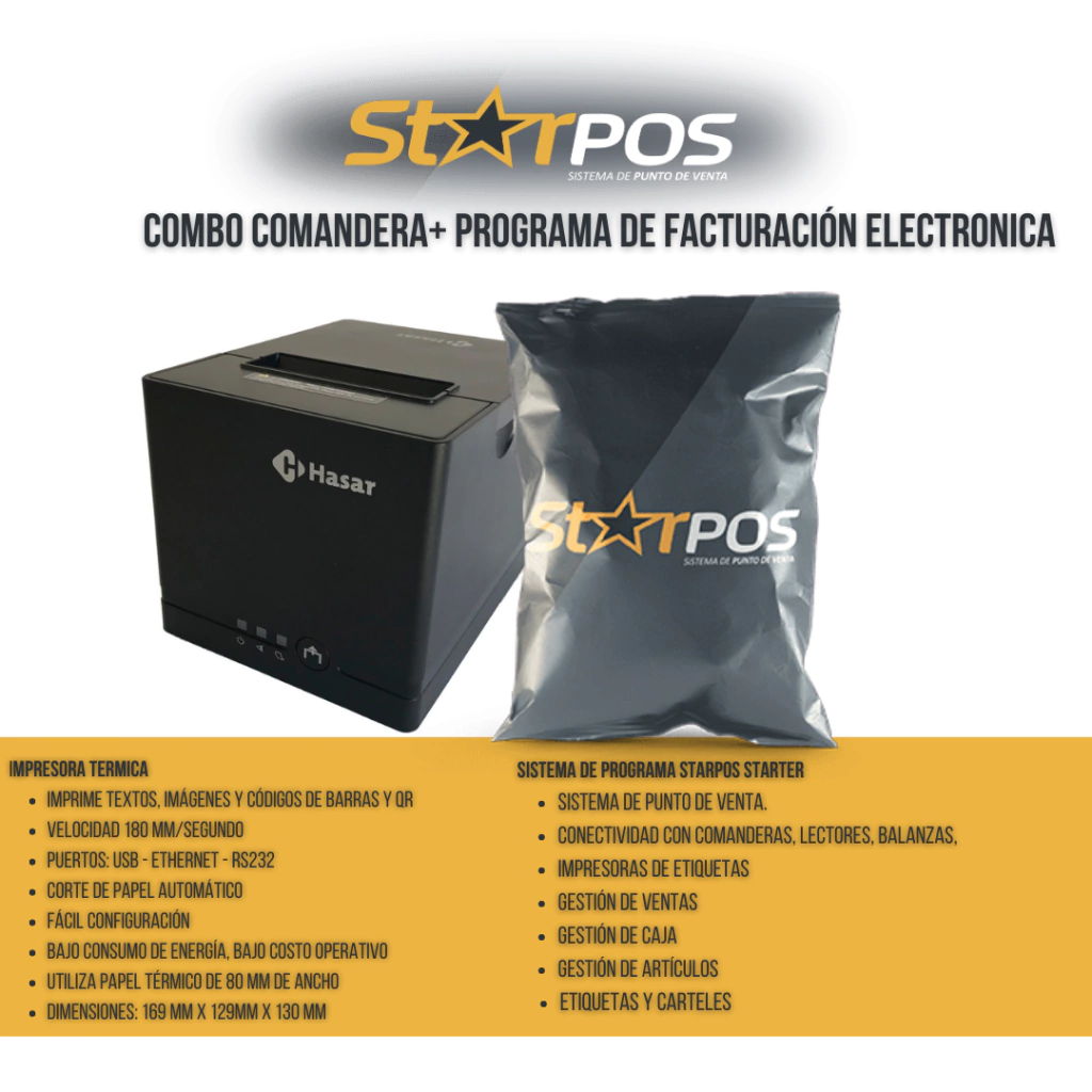 🌟COMBO Comandera + Programa de Facturación Electrónica IMPRESORA TÉRMICA🖨️Impresora TérmicaImprime textos, imágenes, códigos de barras y QR con calidad y velocidad.Velocidad de impresión de 180 mm/segundo para operaciones rápidas.Conexión versátil a través de puertos USB, Ethernet y RS232.Corte de papel automático para una experiencia sin interrupciones.Fácil configuración para empezar a trabajar rápidamente.Bajo consumo de energía y costos operativos para un rendimiento eficiente.Utiliza papel térmico estándar de 80 mm de ancho.Dimensiones compactas de 169 mm x 129mm x 130 mm para ahorrar espacio.💻PROGRAMA DE FACTURACIÓN ELECTRÓNICA STARPOS STARTERSistema completo de Punto de Venta para gestionar tu negocio con facilidad.Conectividad con comanderas, lectores, balanzas, impresoras de etiquetas y más.Gestión integral de ventas, caja, artículos, etiquetas y carteles.🛠️Instalación y Requisitos TécnicosSe instala en su PC (PC no incluida) de forma presencial o remota.Requisitos mínimos de PC: 4 GB de memoria RAM disponibles, Windows 7 en adelante, conexión a internet.¡Haz crecer tu negocio con nuestro combo todo en uno! 🚀