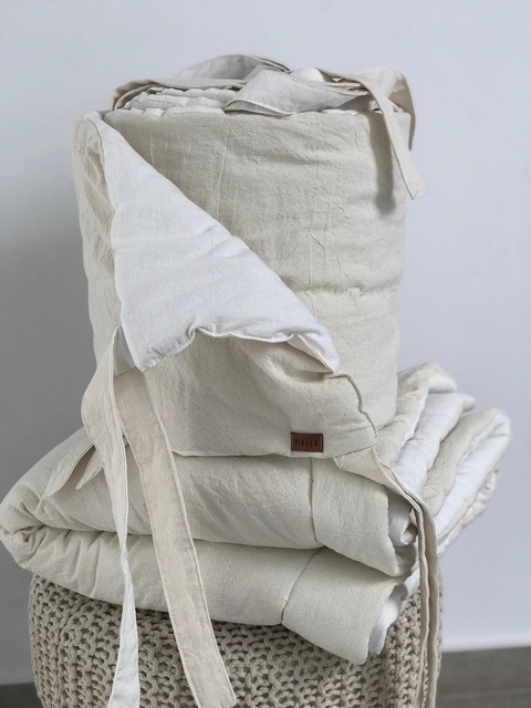 Acolchado + Chichonera Confeccionados en tusor 100% algodon y rellenos con guata.Son reversibles asi que podes elegir 1 color de cada lado y combinarlo como quieras o todo del mismo color.Medidas: - acolchado 120cm x 70cm + Chichonera 2,75m de largo x 0,30 de altoColores: off white, crudo, arena, gris perla, rosa viejo, aqua, verde seco, azul acero, gris elefante y gris cemento.Tenemos algunas combinaciones para entrega inmediata, escribinos!Asegurate de aclararnos la combinación de colores elegida en la casilla de aclaraciones al finalizar tu compra o escribinos por Instagram o Whatsapp.Tiene una demora de confección de 10 días hábiles aproximadamente.