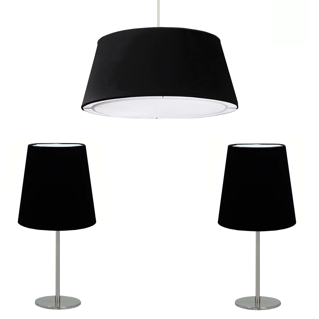 COLGANTE CÓNICO 2 LUCES + 2 VELADORES PLATILCARACTERÍSTICAS COLGANTE- Diámetro superior 35cm - Diámetro Inferior 40cm - Alto 20cm- Colgante con tapa- Cable Cristal- Material: lienzo negro/blanco- Detalle de bies al tono- Zócalo E27 X2- Florón platil- No incluye lámparaCARACTERÍSTICAS VELADORES x2 Unidades- Cuerpo platil (no cromado)- Pantalla: 15cm x 20cm - Alto 20cm- Altura total: 43,5cm- Pantalla lienzo negro/blanco con bies al tono- Zócalo E27- No incluye lámpara