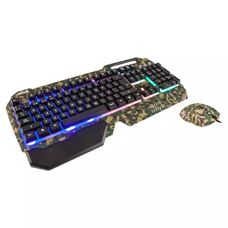 Combo Gamer ideal para jugadores de multiplayer on-line, rpg, first person shooter y cualquier juego con interface basada en Teclado + Mouse disponible en el mercado.Teclado construido sobre estructura metálica con teclas resistentes "strong pressure" y con sistema WASD (teclas intercambiables).Mouse Gamer con Resolución Máxima de 3200 DPI.Su Diseño Gamer es óptimo para largas sesiones de juego en las que puedas apoyar tus manos.Su retroiluminación LED Multicolor te permite jugar con la luz apagada con total control y precisión.- Teclado Gamer Camuflado con 104 teclas- Teclas resistentes "strong pressure" y con sistema WASD (teclas intercambiables)- Retroiluminación LED Multicolor- Construido sobre estructura metálica- Cable trenzado de 1,5 metros- Conexión USB 2.0- Mouse Gamer Camuflado- 7 Botones y Scroll- Resolución Máxima de 3200 DPI- Cable trenzado de 1,5 metros- Conexión USB 2.0