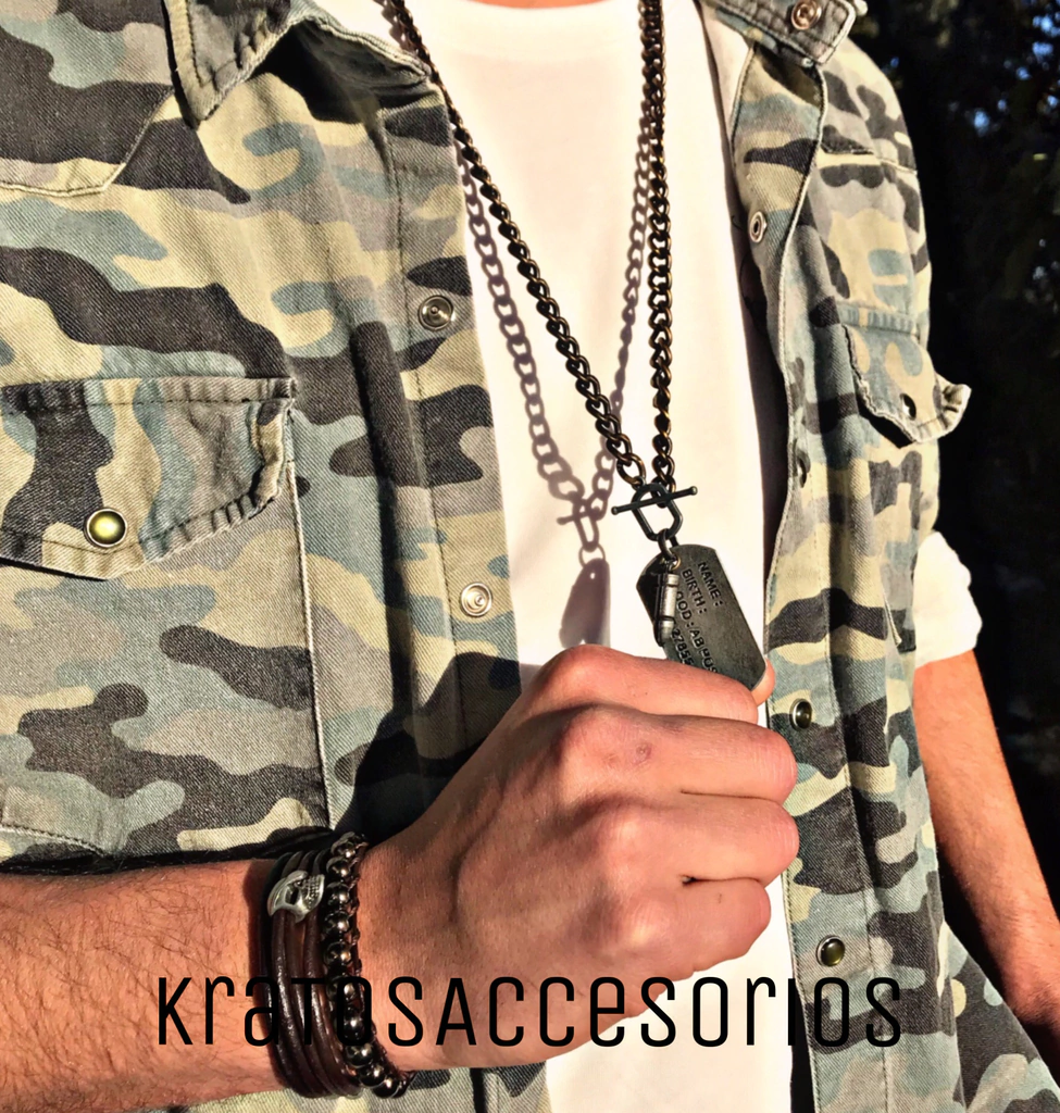 Como collar y pulsera.Collar Militar:cadena plana en fundición color plata o bronce opaca con cierre tipo palo cuadrado o redondo según disponibilidad de stock. Dije de chapa militar identificatoria y bala. Largo 70 cm.Brazalete Lima:Pulsera compuesta por cadena groumet de 5 mm de espesor en tono plata vieja con cierre de broche tipo mosquetón. Disponible del talle S al XXL.Si no sabes tu talle esta disponible la guía de talles.Recomendamos cuidar del agua, cremas y perfumes.