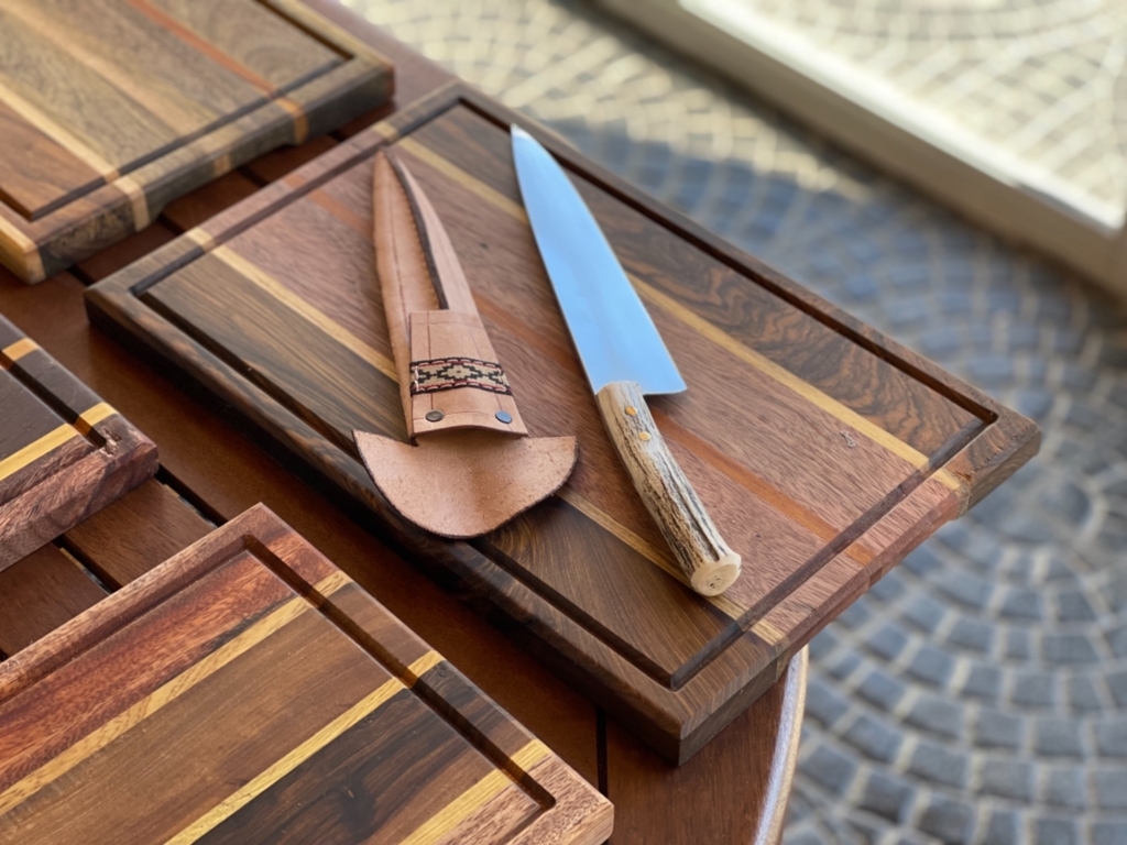 ¡PROMO IMPERDIBLE! codigo N12 - Tabla premium 27x50,5 cm. 100% artesanal , mezclas de maderas duras y estacionadas. - Cuchillo ciervo regional cabo de ciervo y hoja de acero al carbono con aleacion boro. (largo de hoja 21cm)