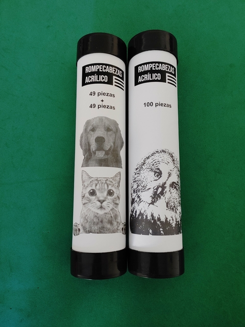 Rompecabezas de acrílico transparente cortado y grabado láser con la imágen de un adorable perrito y otro de un tierno gatito.