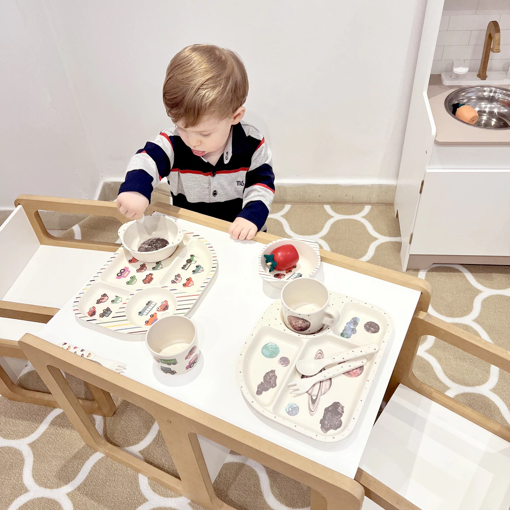 Este combo de mesa y sillas Montessori es la elección perfecta para acompañar el crecimiento de los más peques fomentando la creatividad y la interacción. Es ideal para el aprendizaje y el juego. Fabricado en Mdf pintado y barnizado. Las sillas tienen 2 posiciones con solo rotárlas, permitiendo un asiento bajo para los más peques y un asiento alto a medida que crecen.