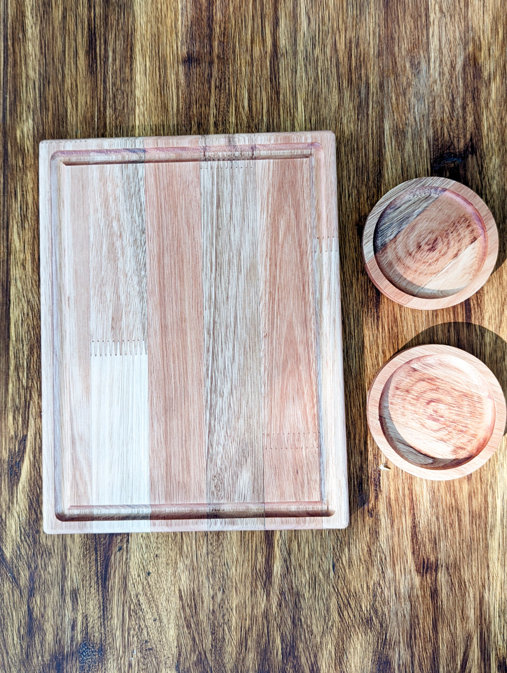 Combo de tabla y 2 cuencos fabricados en entablonado finger de eucalipto.