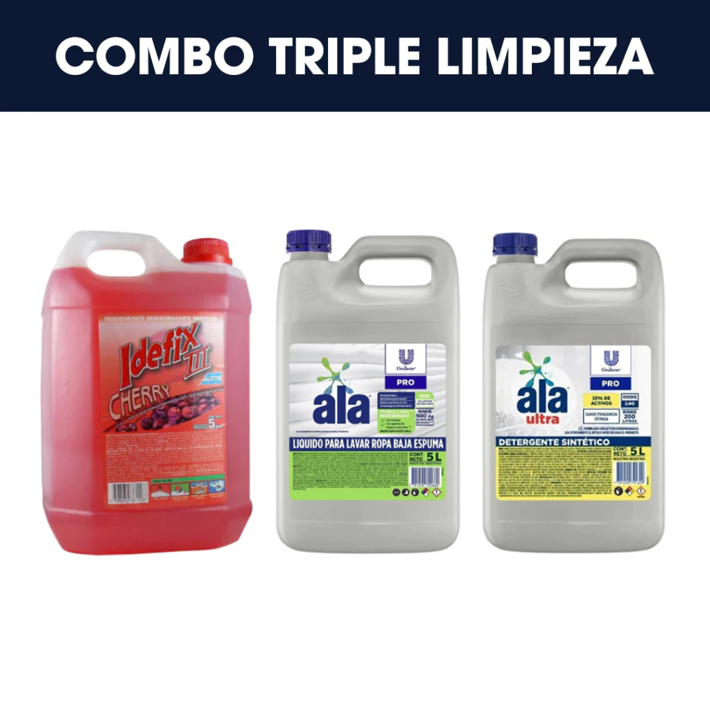 Contiene:- 1 Ala Ultra detergente 5lts- 1 Ala Ecolavado para ropa 5lts- 1 Idefix limpiador para pisos Cherry 5lts