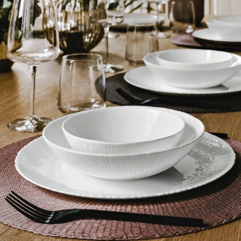 Vajilla de diseño Italiano, en color blanco, platos con superficie posterior en textura de realce permitiendo un mejor agarre, fabricada en vidrio opal de gran durabilidad, vidrio templado, no poroso que brinda mayor higiene.