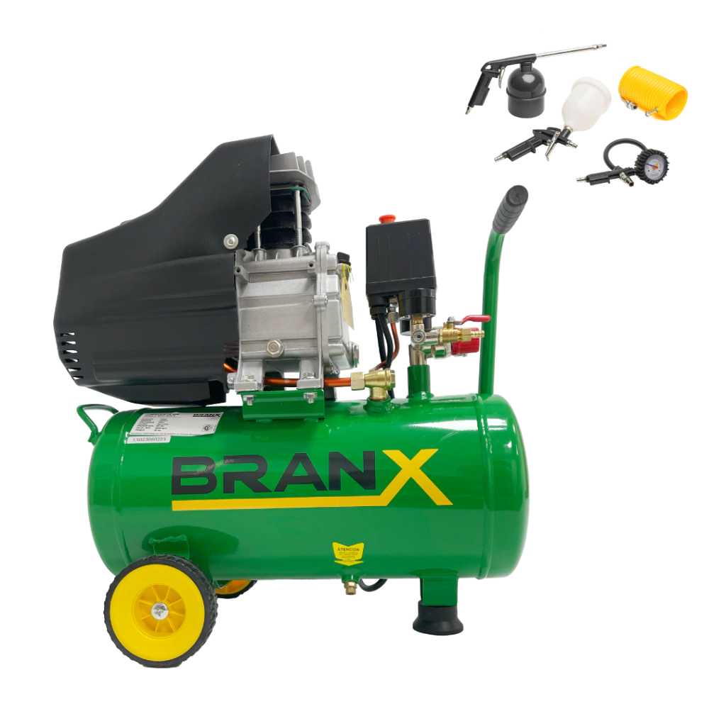 Compresor de aire BranxCon tu compresor BRXC-2525 , las tareas manuales que requieran presión de aire serán mucho más sencillas. Ahorrá tiempo y lográ excelentes resultados sin esfuerzo.Para trabajos domésticosSu potencia de 2hp lo convierte en la herramienta necesaria para labores domésticas que requieren un nivel bajo de presión. Además, la capacidad del tanque de 25L permite usos puntuales y por un corto período de tiempo, lo que te permitirá recargarlo rápidamente para volver a utilizarlo cuando quieras.Ficha tecnica:TENSION: 220VFRECUENCIA: 50HZPOTENCIA: 2HPCAPACIDAD: 25LPRESION MAX.: 115PSIFLUJO DE AIRE: 160L/min.SALIDA DE AIRE: 2VELOCIDAD DE ROTACIÓN: 2850RPMMANÓMETRO DOBLEMANGUERA: 5mtsPESO: 20KG aprox.El ciclo de trabajo es de 20 minutos de trabajo por 10 min. de descanso. Uso máximo recomendado por día: 1 hora 30 minutosIncluye:- 1 pistola de pintura- 1 pistola sopladora- 1 manguera espiral
