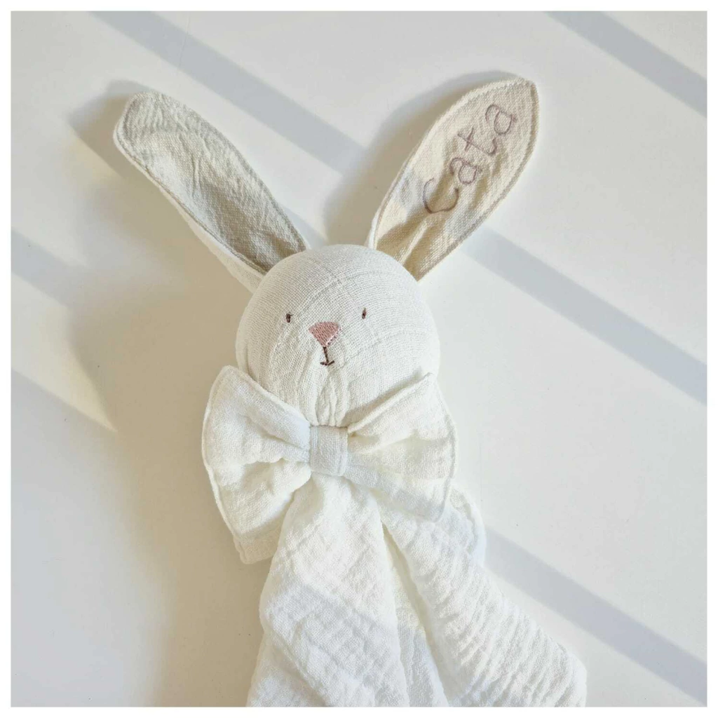 Conejito de apego confeccionado en gasa de algodón de tejido doble, con su cabecita rellena de vellón siliconado.