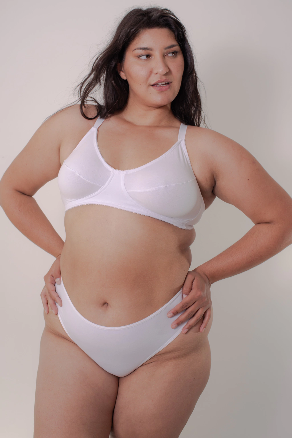 Detalles y calce:Corpiño:Corpiño con falso aro, sin relleno. Tiene breteles fijos, regulables, y en la espalda tiene broche de tres posiciones. Nos inspiramos en el conjunto Bruna pero sacamos el aro, manteniendo una costura curva que lo reemplaza y manteniendo la vaina, por lo que brinda una contención muy similar sin la rigidez del aro.Bombacha:Vedetina tiro alto, con un calce mega cómodo.Tela:Algodón con lycra premium.Talles:Corpiño 90 al 120. Del 110 al 120 tiene breteles y elásticos de contorno más anchos. Cami (Fotos 1 a 5) está usando talle 115, Flor (foto 6) está usando talle 90.Bombacha: 2 al 6. Cami (Fotos 1 a 5) está usando talle 5, Flor (foto 6) está usando talle 2.Si querés chequear cómo tomarte las medidas hacéclick acá.Tabla específica del producto:Cuidados:Si querés maximizar su durabilidad, lavar a mano con agua fría.También podés lavar en lavarropas, también con agua fría, preferentemente separado en una bolsa de red específica.