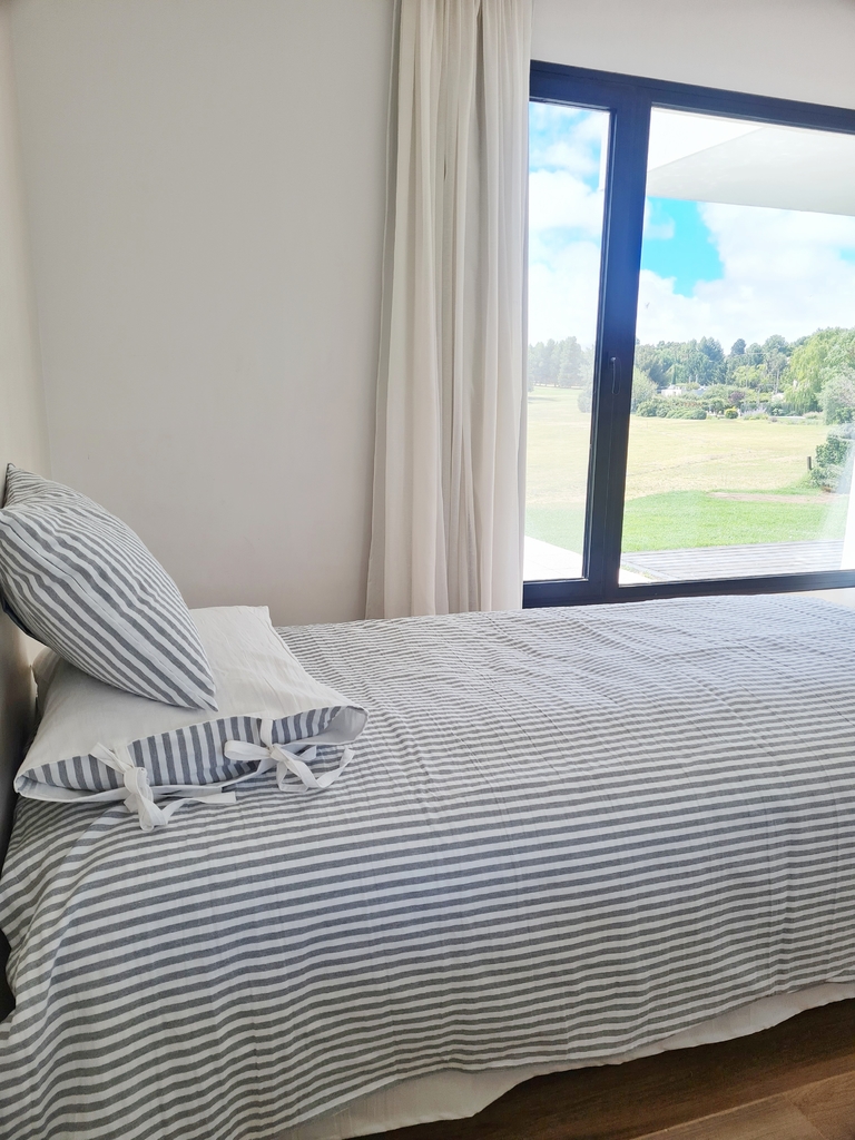 Set compuesto por funda de edredón en Tussor rayado a elección combinado con tussor liso 100% algodon prelavado y decatizado. Cada conjunto viene con las fundas de almohadas en mismo Tussor rayado. Para ubicar cómodamente el edredón de relleno, tiene un cierre escondido entre pestañas colocado a lo ancho y trae 4 tiritas internas en cada esquina para atar al edredón.