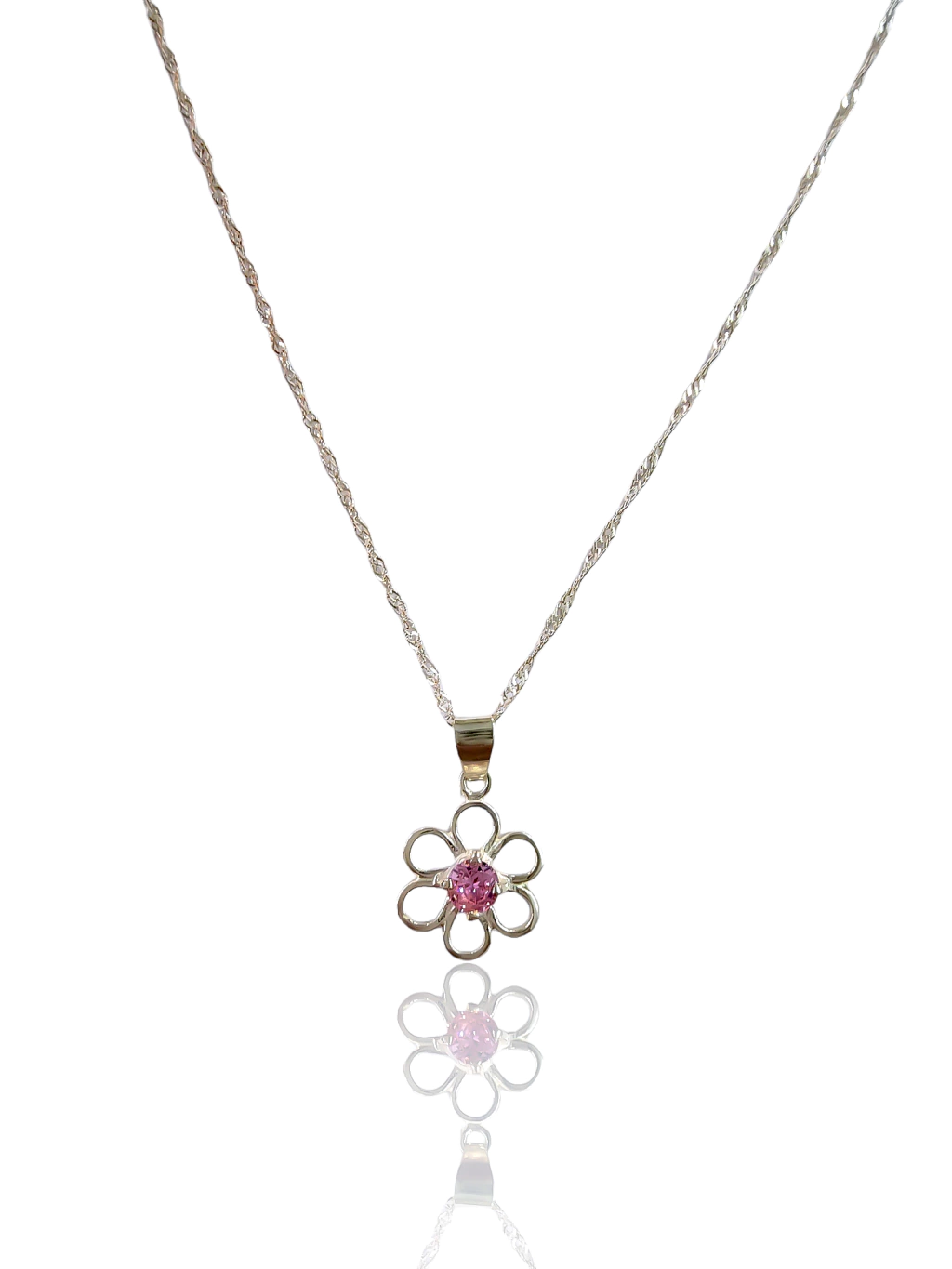 En la imagen: conjunto de cadena de plata 925 y dije con forma de florcita calada y cubic rosa en el centro. La cadena es modelo Singapour y tiene un largo de 45 cm de largo.