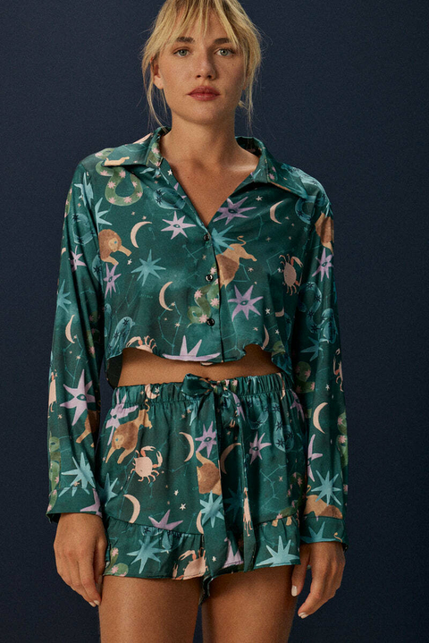 Nuestro conjunto combina elegancia y comodidad para brindarte un look sofisticado y moderno. La camisa tipo crop presenta un diseño elegante con cuello de solapa que añade un toque de sofisticación, mientras que las mangas largas con botones en los puños aportan un toque moderno y versátil. Confeccionada en satén estampado de calidad premium, el tejido satinado ofrece un brillo sutil y una sensación suave al tacto.El short con volados del conjunto presenta un calce amplio, brindándote comodidad y estilo. Además, cuenta con un elástico en la cintura que proporciona un ajuste seguro y personalizado. La composición de 100% poliéster garantiza una durabilidad excepcional y un ajuste cómodo.